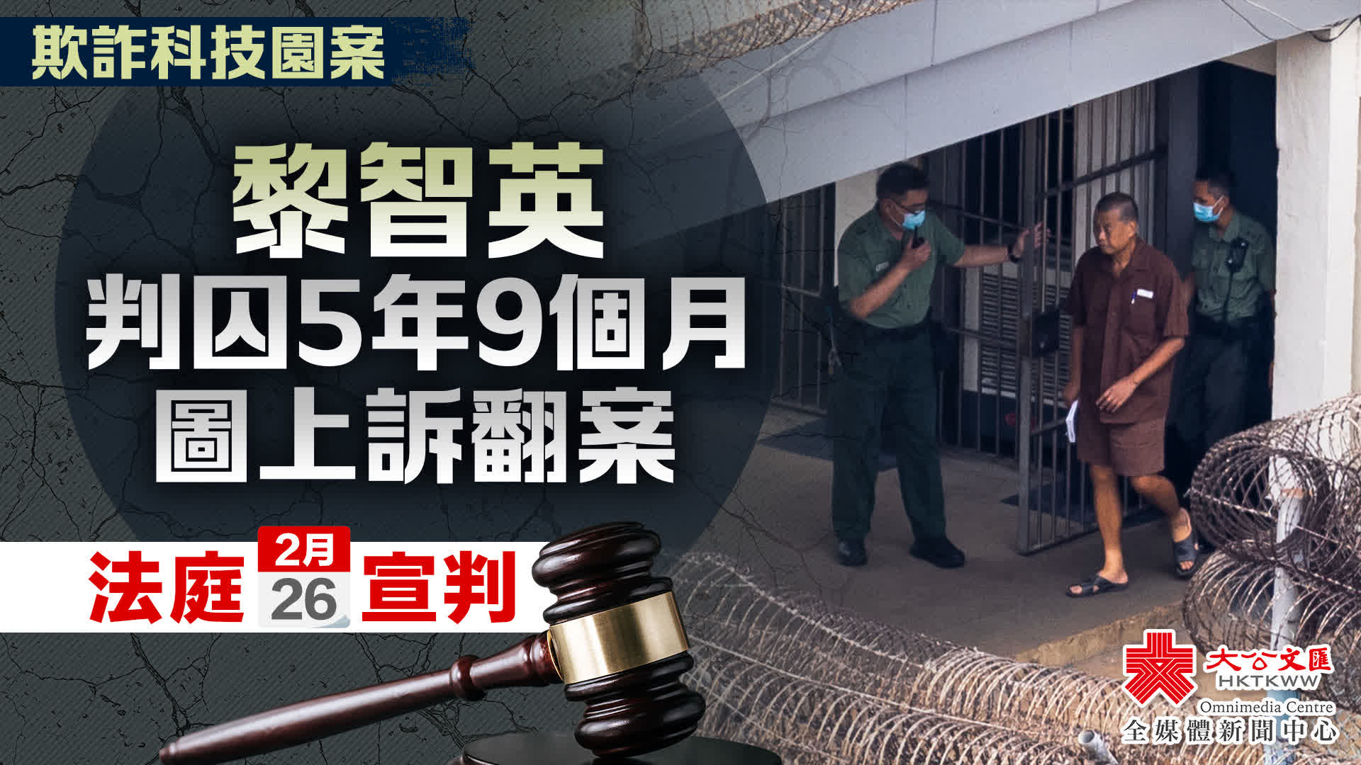 同案被告黃偉強則被判囚21個月,由於他已完成服刑,故放棄刑期上訴。另外,黎智英在本月9日被裁定串謀勾結外力危害國安等三罪罪成,被高等法院原訟法庭判囚20年,其中18年刑期需與欺詐案的刑期分期執行。