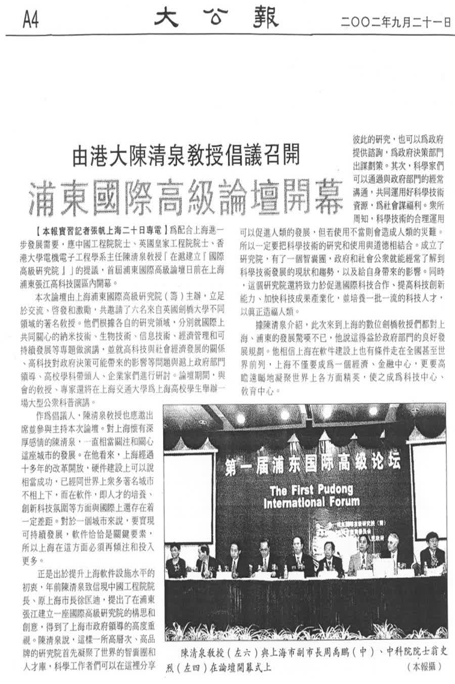 我心中的這個火種,早在2001年住在丘吉爾學院期間就被點燃了。當時我策劃在上海浦東建立國際高等研究院,終於在2002年9月19日至24日舉行成立儀式並舉辦首屆論壇,時任上海市副市長周禹鵬出席開幕式並致辭。在籌備過程中,很榮幸得到時任上海市長徐匡迪院士和時任劍橋大學校長Alec Broers爵士的大力支持。我組織了劍橋大學的六位頂級院士教授到上海浦東國際高等研究院作科技前沿主旨演講,接着又到上海交通大學禮堂向上海高校的學生代表作科普演講。他們是: