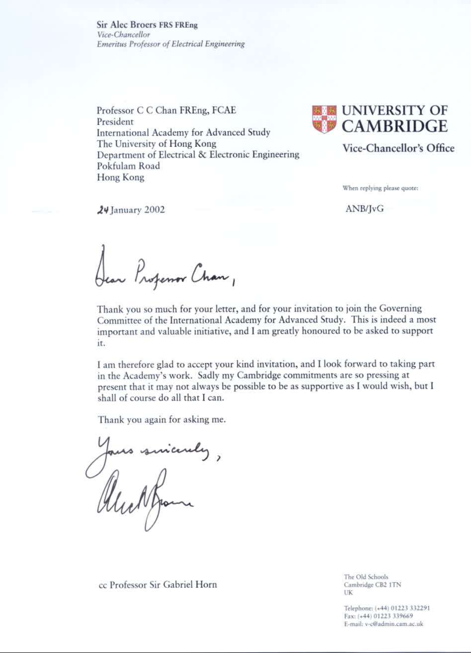 以下是時任劍橋大學校長Alec Broers的支持信及《大公報》的報道。