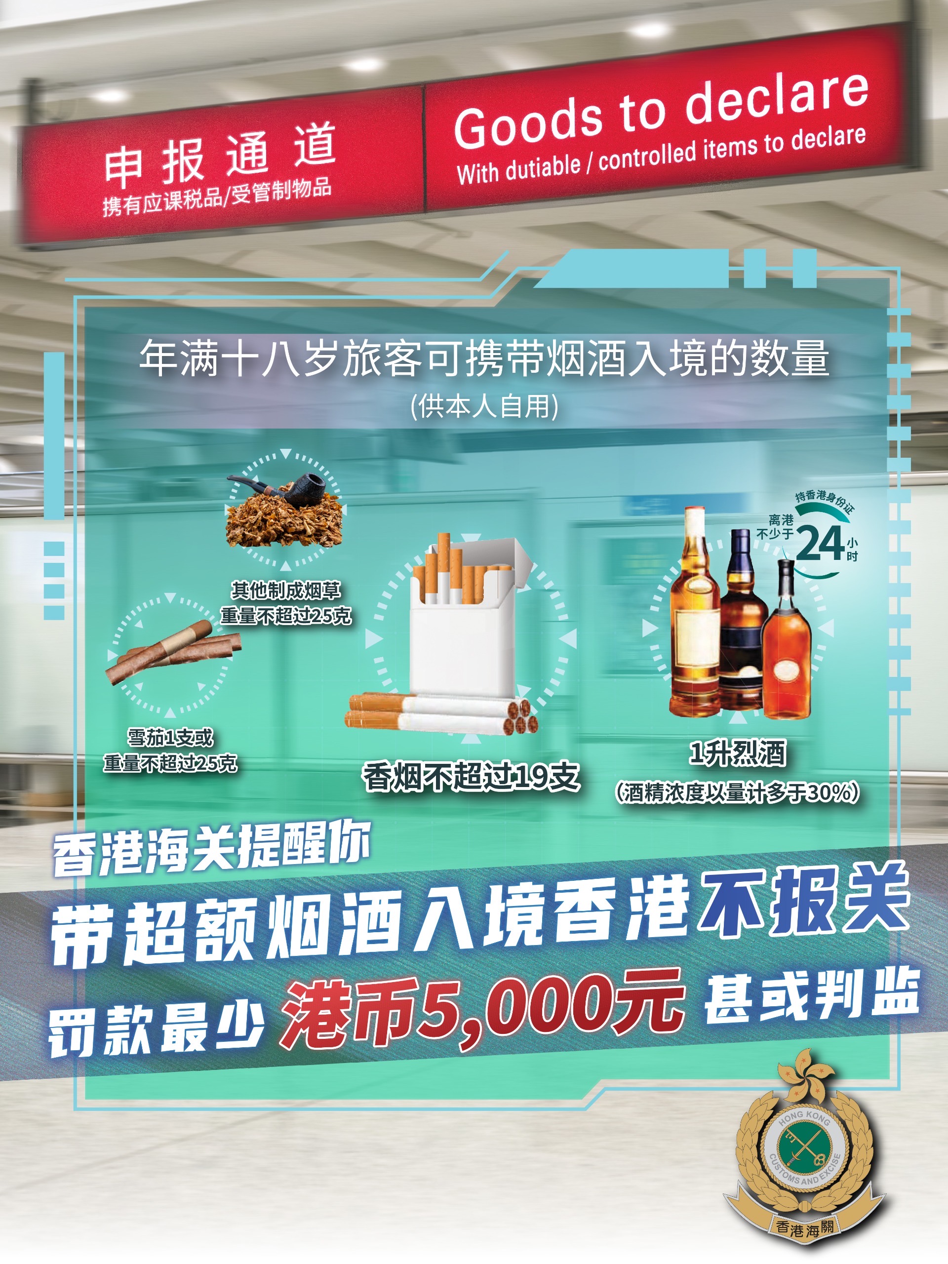 根據香港法例第 109 章《應課稅品條例》,旅客如攜帶超逾豁免數量的飲用酒類或煙草入境,應使用紅色通道向海關人員申報,否則,一經定罪,最高刑罰為罰款港幣 2,000,000 元及監禁 7 年。