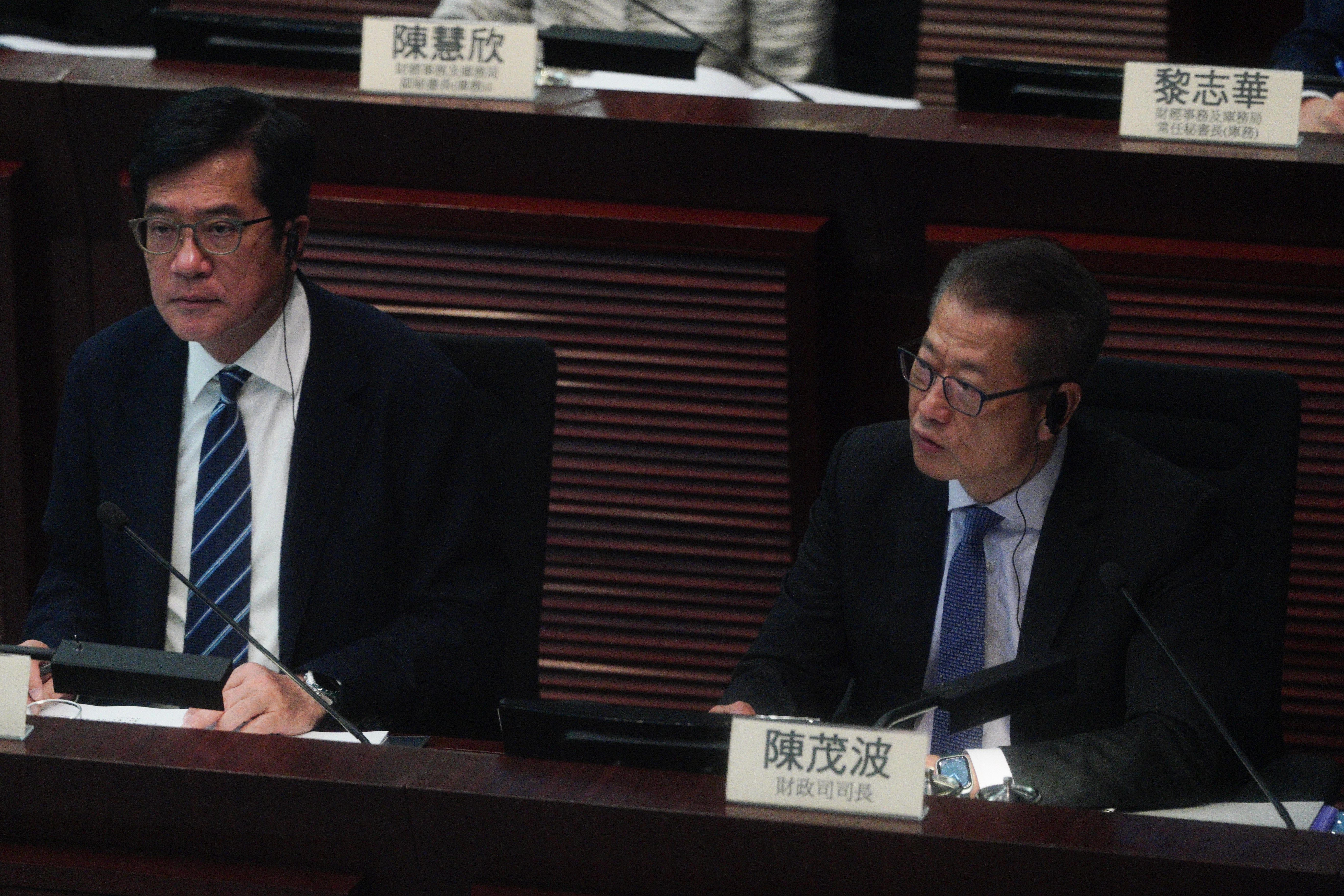 (大公文匯全媒體 記者 劉鴻霖)新一份財政預算案於昨日(25日)公布。財政司司長陳茂波、財政司副司長黃偉綸等今日(26日)出席立法會財務委員會會議,回應議員提問。