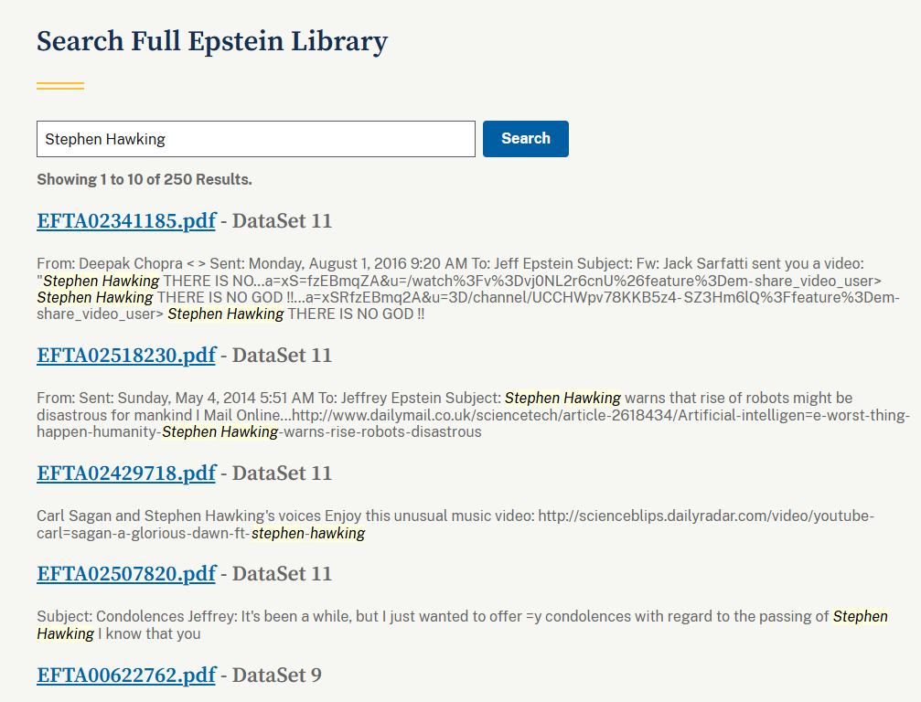 司法部的愛潑斯坦檔案庫中,霍金的名字至少被提及250次,其中一次被點名,與愛潑斯坦著名指控者弗吉尼亞・朱弗雷的說法有關,朱弗雷曾聲稱霍金在維爾京群島參與過「未成年派對」。不過相關文件顯示,愛潑斯坦曾在去年1月12日,給其同夥吉斯萊恩・麥克斯韋發送過一封存在拼寫錯誤的電子郵件,郵件中提到,他願意向朱弗雷的朋友、熟人或家人提供現金獎勵,只要他們能站出來駁斥朱弗雷的指控。