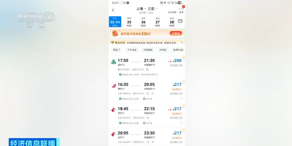 訂票平台數據顯示,春節假期後,上海至北京、三亞、哈爾濱、西雙版納等多條航線推出折扣機票,單程票價低至200元。北京飛往三亞、廣州飛往北京的機票價格均在400元左右。