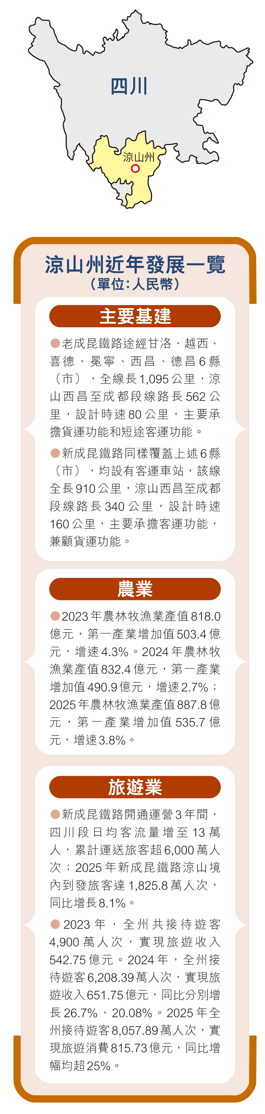 (香港文匯報記者 向芸 成都報道)從1970年7月成昆鐵路全線竣工運營,火車沿着交替的山洞和橋樑首次開進四川大涼山,到2022年12月新成昆鐵路全線開通運營,大涼山正式邁入「動車時代」;從2012年4月全長240公里的四川省雅安至西昌高速公路建成通車,到2020年6月中國最後一個具備條件通硬化路的建制村阿布洛哈村開通客運班線……一條條鐵路、公路的貫通,不僅讓崇山峻岭間的大涼山通往外界的時間大大縮短,更讓500多萬大涼山群眾的出行夢、致富夢照進現實。