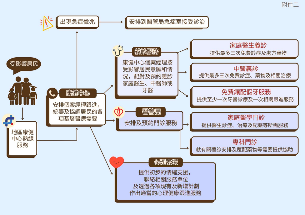 同時,基層醫療署與醫管局亦會為有醫療需要的受影響居民提供優先預約家庭醫學門診服務及中醫診所暨教研中心服務。居民可透過醫健通流動應用程式中「支援火災影響居民—家庭醫學門診優先預約」圖示,按指示優先預約醫管局家庭醫學門診服務,或透過電話優先預約醫管局中醫診所暨教研中心服務。