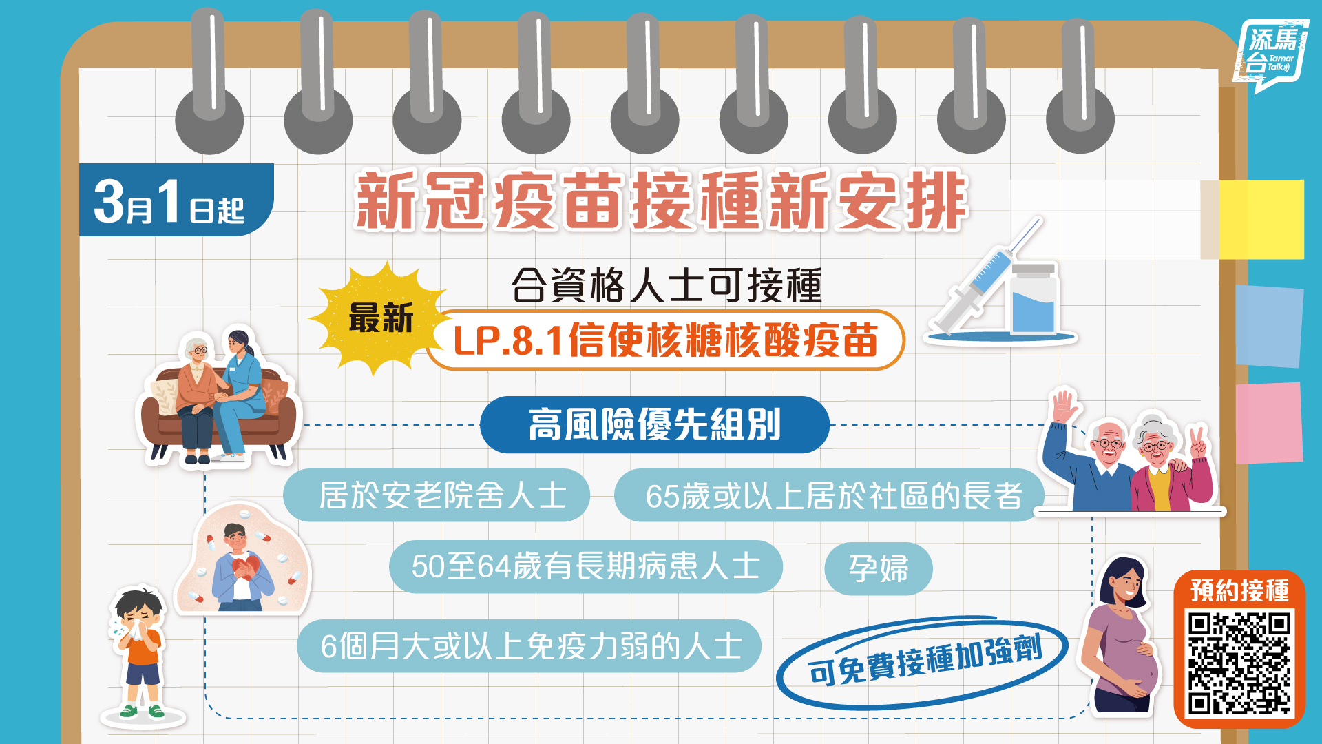 由3月1日起,新冠疫苗計劃將會按已更新的高風險優先組別建議,為合資格人士接種加強劑,同日起亦會為12歲或以上合資格人士提供新冠LP.8.1信使核糖核酸疫苗(LP.8.1疫苗),代替現時使用的JN.1疫苗。看圖了解詳情。
