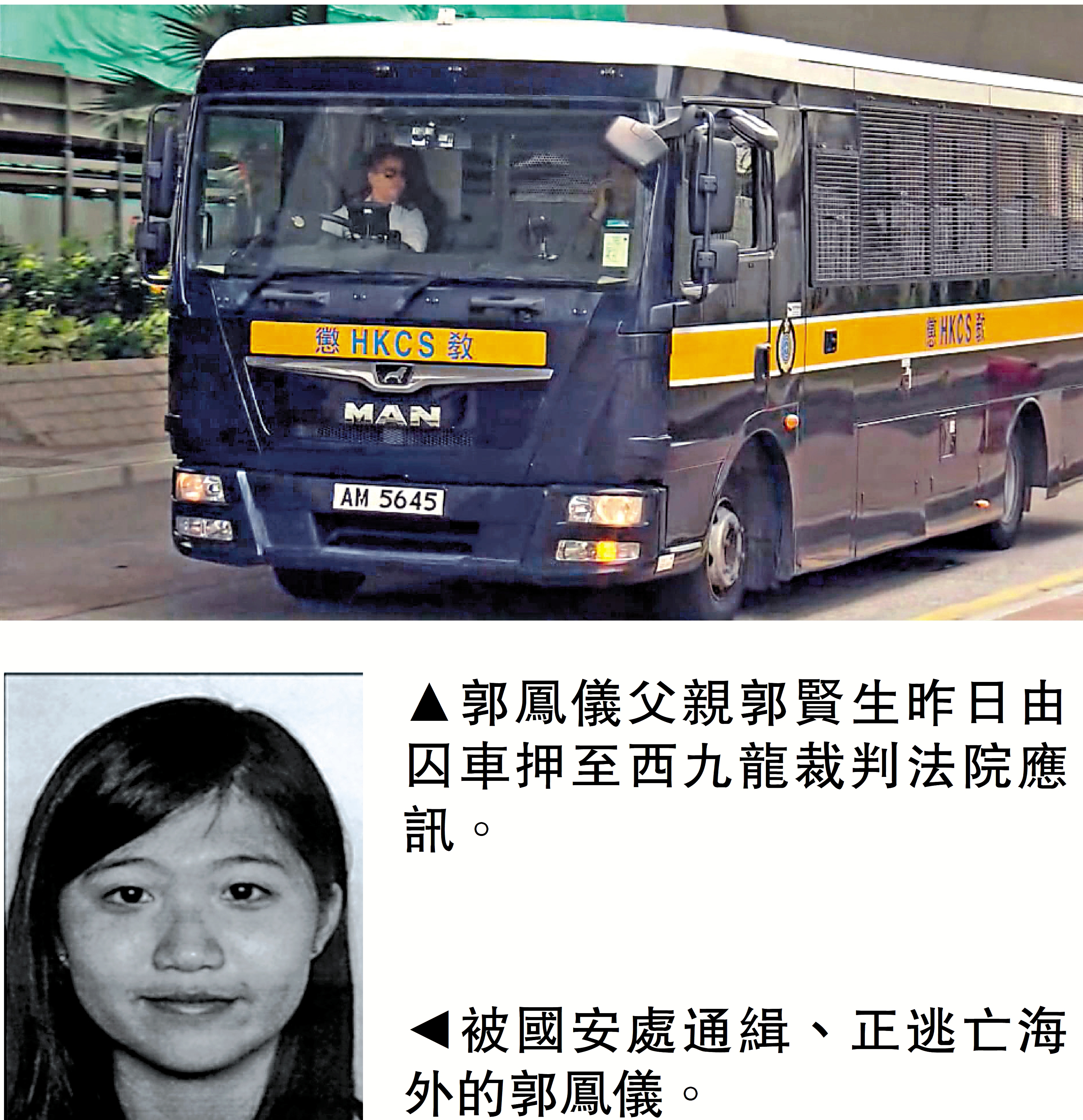 大公報報道,被警方國安處懸紅百萬通緝的逃犯郭鳳儀,其父郭賢生去年初協助處理她的保單資金,包括更改保單持有人,提取超過八萬元保單結餘。其後警方引用《維護國家安全條例》控告郭父企圖處理潛逃者財產罪。郭父早前被裁定罪成,昨日於西九龍裁判法院被判囚8個月。這也是首宗「企圖處理潛逃者財產罪」案件。