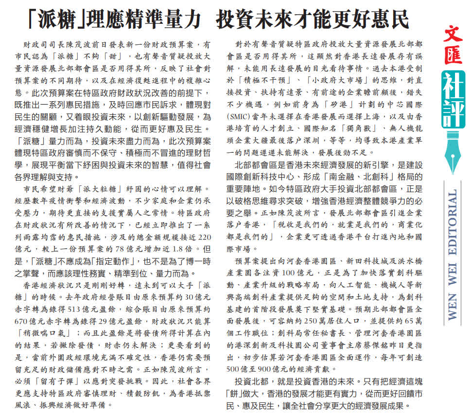 財政司司長陳茂波前日發表新一份財政預算案,有市民認為「派糖」不夠「甜」,也有聲音質疑投放大量資源發展北部都會區是否用得其所,反映了社會對預算案的不同期待,以及在經濟復甦進程中的複雜心態。此次預算案在特區政府財政狀況改善的前提下,既推出一系列惠民措施,及時回應市民訴求,體現對民生的關顧,又着眼投資未來,以創新驅動發展,為經濟穩健增長加注持久動能,從而更好惠及民生。「派糖」量力而為,投資未來盡力而為,此次預算案體現特區政府審慎而不保守、積極而不冒進的理財哲學,展現平衡當下紓困與投資未來的智慧,值得社會各界理解與支持。