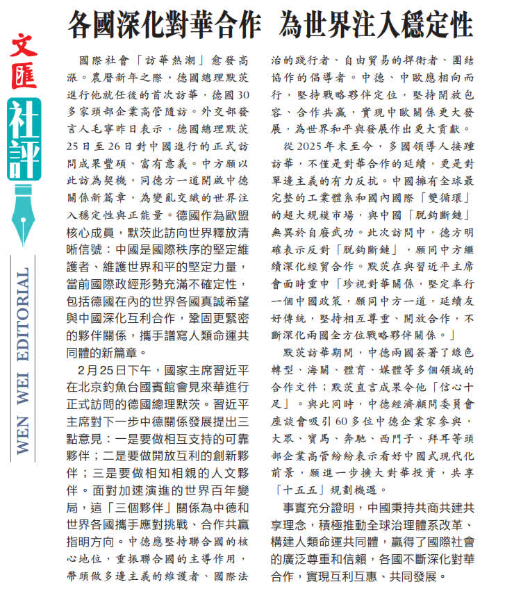 國際社會「訪華熱潮」愈發高漲。農曆新年之際,德國總理默茨進行他就任後的首次訪華,德國30多家頭部企業高管隨訪。外交部發言人毛寧昨日表示,德國總理默茨25日至26日對中國進行的正式訪問成果豐碩、富有意義。中方願以此訪為契機,同德方一道開啟中德關係新篇章,為變亂交織的世界注入穩定性與正能量。德國作為歐盟核心成員,默茨此訪向世界釋放清晰信號:中國是國際秩序的堅定維護者、維護世界和平的堅定力量,當前國際政經形勢充滿不確定性,包括德國在內的世界各國真誠希望與中國深化互利合作,鞏固更緊密的夥伴關係,攜手譜寫人類命運共同體的新篇章。