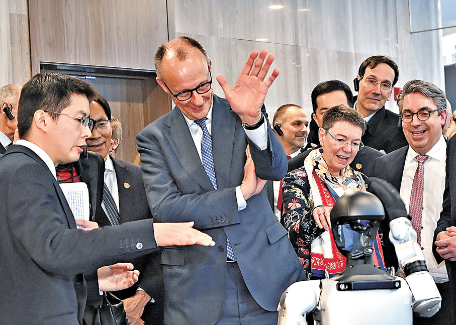 在杭州宇樹科技參觀期間,默茨一行觀看了人形機器人寫「福」字、表演拳擊和武術,以及在工廠和家庭場景中的應用展示,全程興趣滿滿。德企高管們也對宇樹機器人連連點讚,不僅排隊與機器人合照留念,荷貝克電源系統首席執行官Marc Zoellner還牽起機器人的手「共舞」一曲,站在一旁的代表團成員還打趣說道:「別把它弄壞了,它很貴的。」