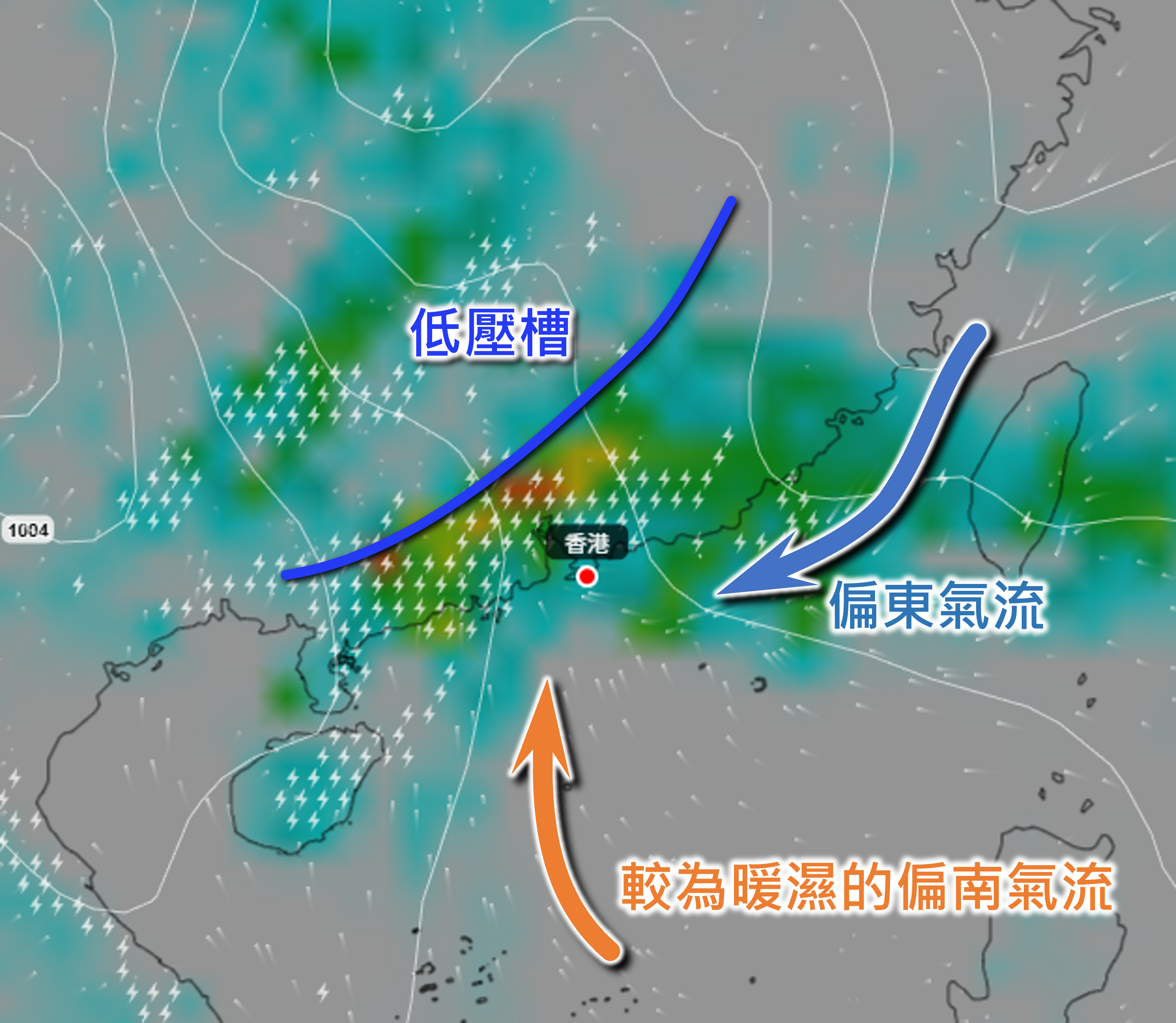 從天氣圖分析可見,一股偏東氣流將於周六(28日)逐漸影響廣東沿岸,並在珠江口一帶與低壓槽南側較暖濕的偏南氣流交匯,形成輻合區。該兩股氣團相遇時,將迫使空氣抬升,有利於對流與降雨發展,並可能為香港帶來今年首場較為顯著的降雨過程。