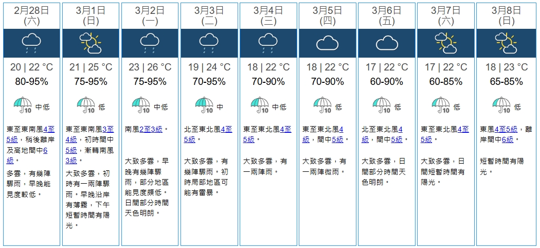 適逢下周二(3月3日)為元宵佳節,當晚將上演月全食天象。惟若當日雲層密布或降雨持續,市民或難以完整觀賞皓月盈虧之景。氣溫預計介乎19至24度之間,外出賞月或參與節慶活動時宜攜帶雨具備用。下周四(3月5日)則迎來二十四節氣中的「驚蟄」,春雷始鳴,萬物復甦,民間素有「打小人」習俗,以祈驅除晦氣、迎祥納福。初春天氣變幻莫測,濕氣瀰漫,市民除了留意天氣變化外,亦應注意保暖防潮,保重身體,以防疾病乘虛而入。