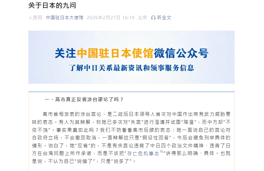 大公文匯全媒體報道,2月27日,中國駐日本大使館轉發人民網評論員文章《關於日本的九問》。以下為全文: