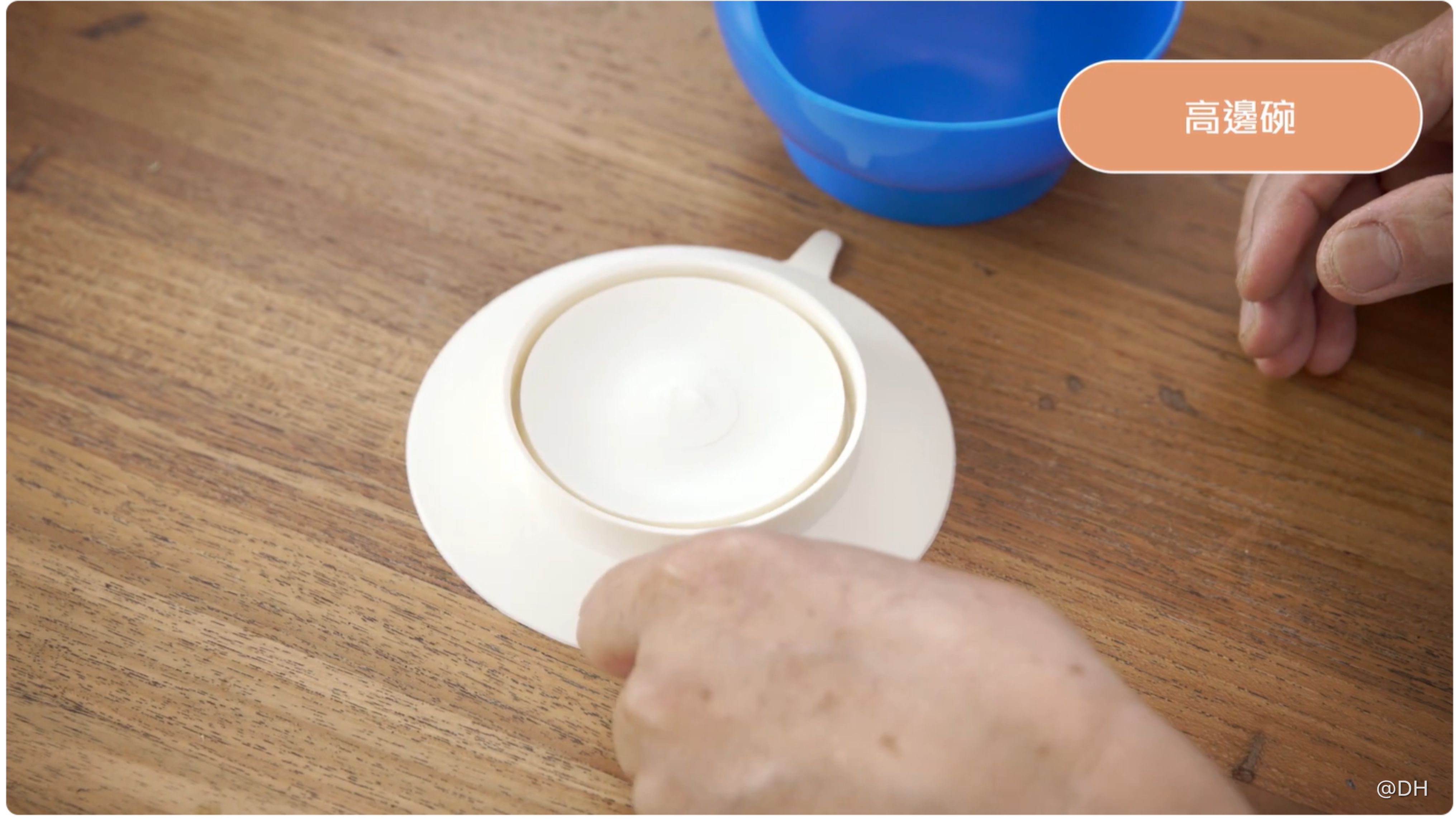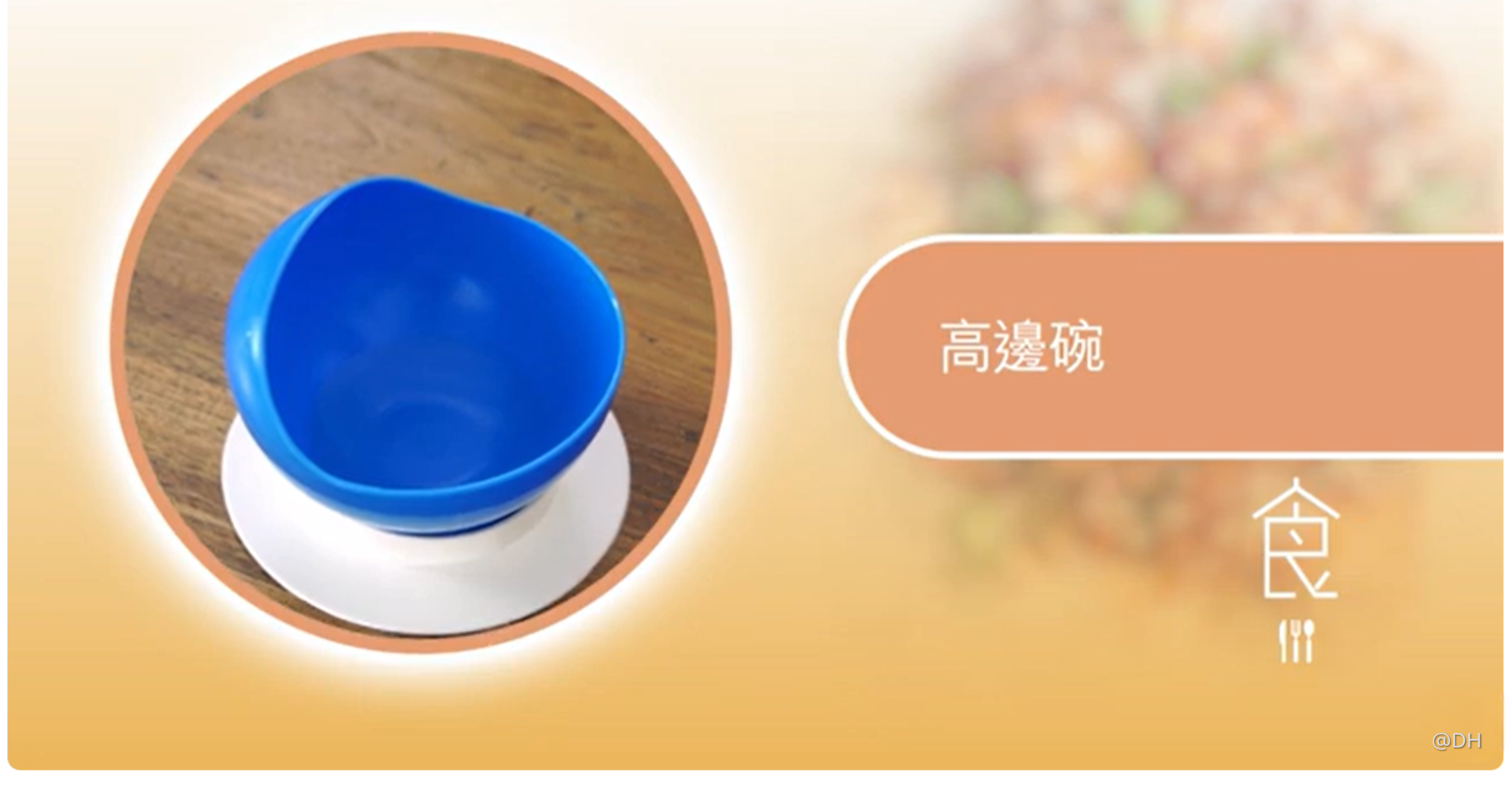 適用於手部功能有限的人士,其高邊設計能防止食物溢出,方便用單手舀取食物。碗底設有吸盤,可固定於桌面,避免移位。使用時,同樣需保持安靜、光線充足、安全環境,以幫助長者專注進食。