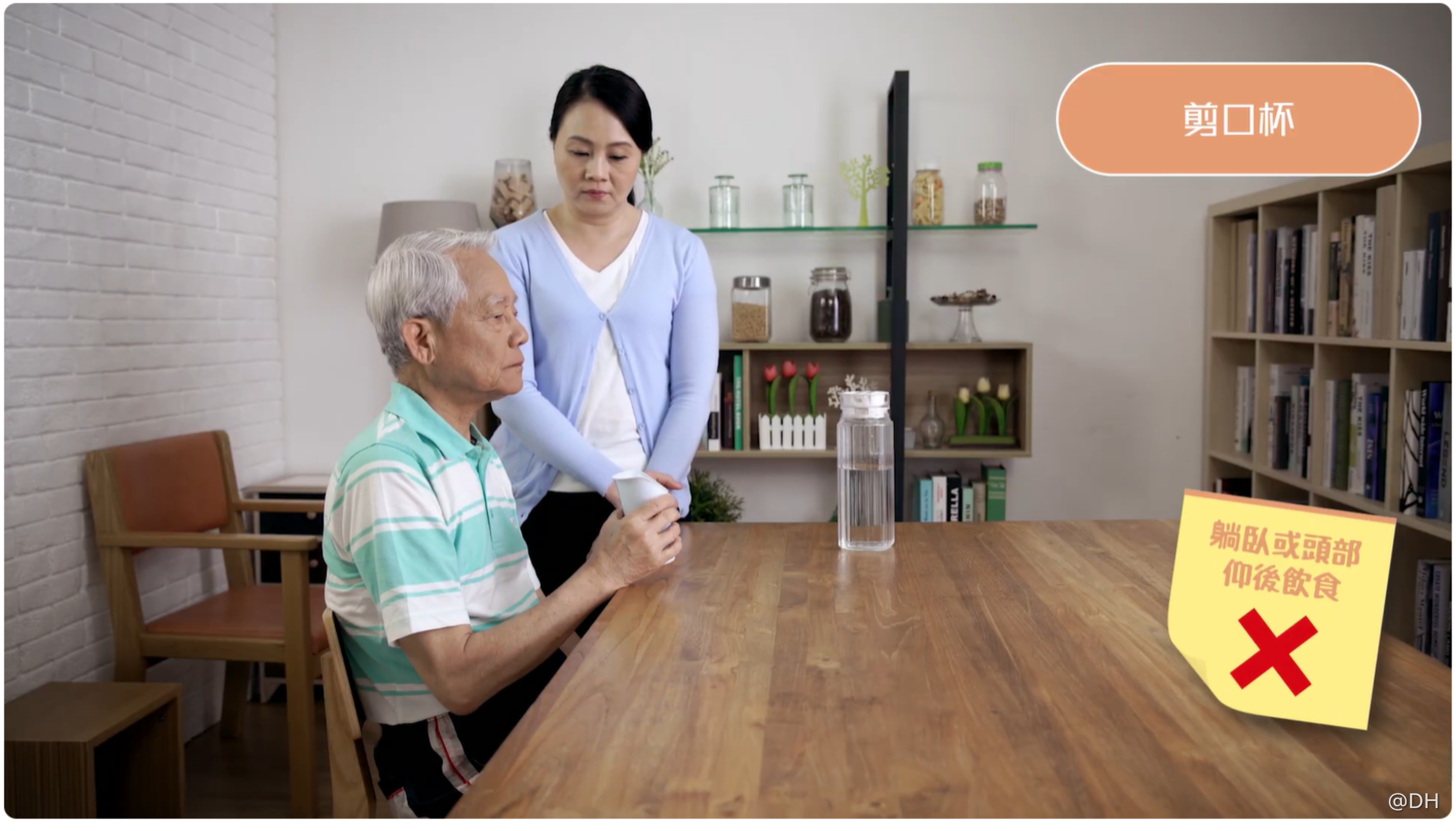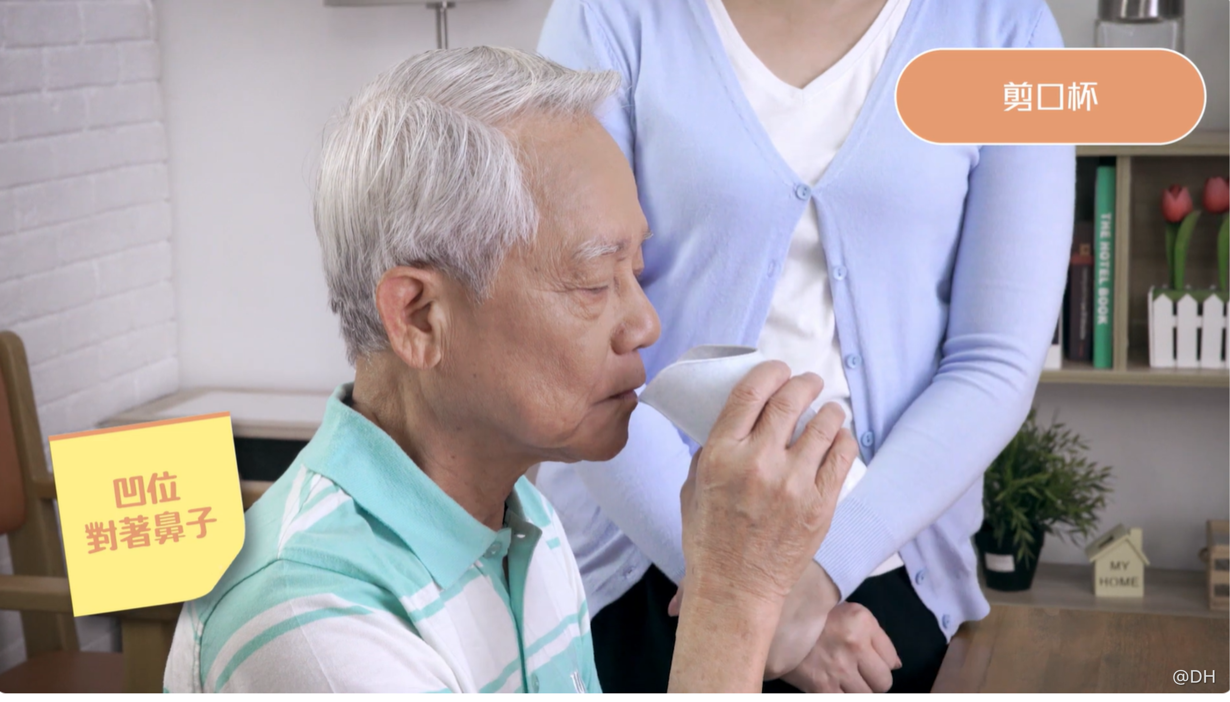 杯口有特別剪裁設計,使用者無需仰頭即可飲用,從而降低嗆咳風險。使用時,應確保飲食環境安靜、光線充足,並保持正確坐姿,家具穩固。長者可依個人需要選擇合適的杯型與大小。護老者亦需注意長者飲水時的姿勢,特別是有吞嚥障礙的人士,切勿躺下或抬高頭飲水,應控制飲水的流量和速度,並鼓勵他們每一口只飲少量的水。