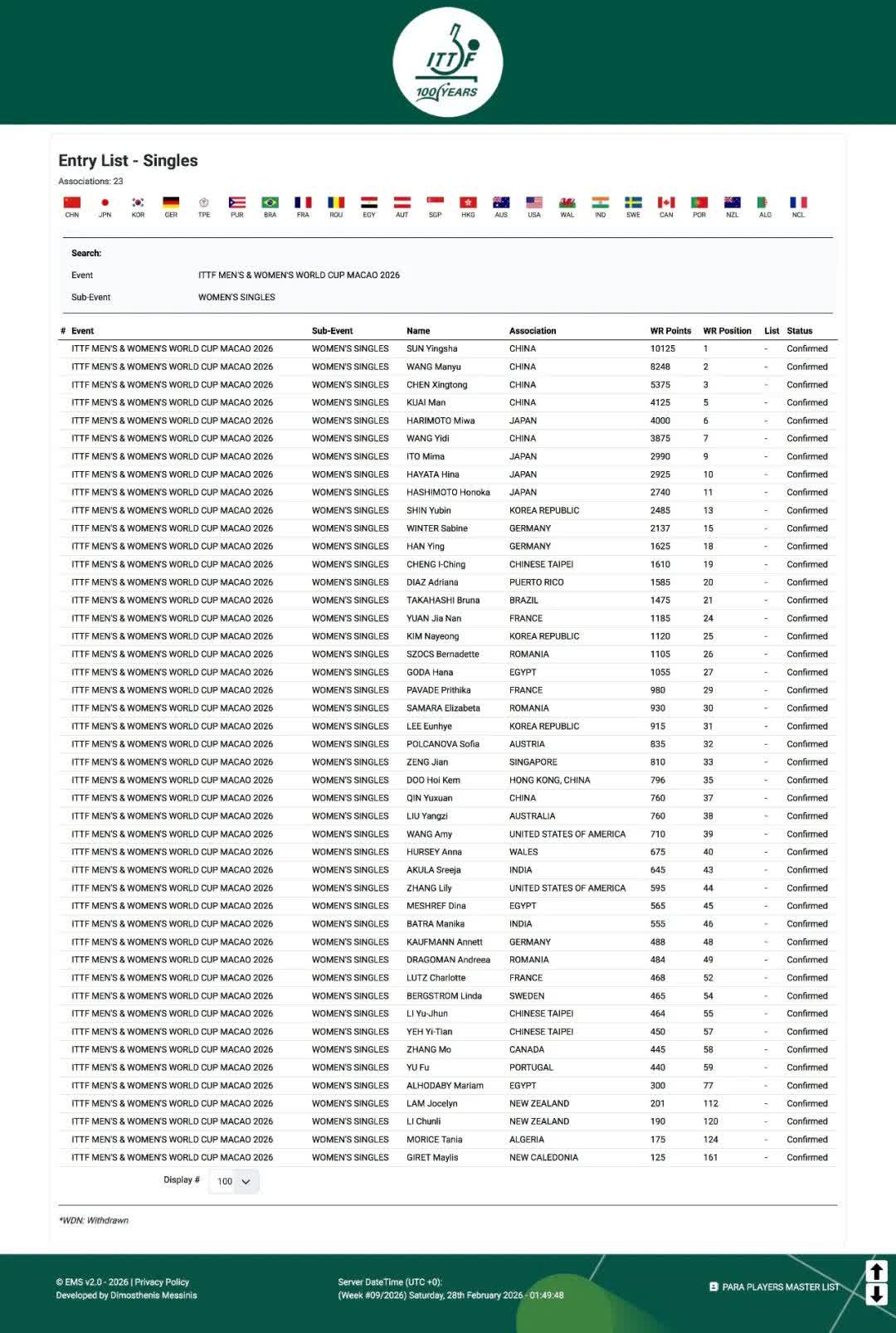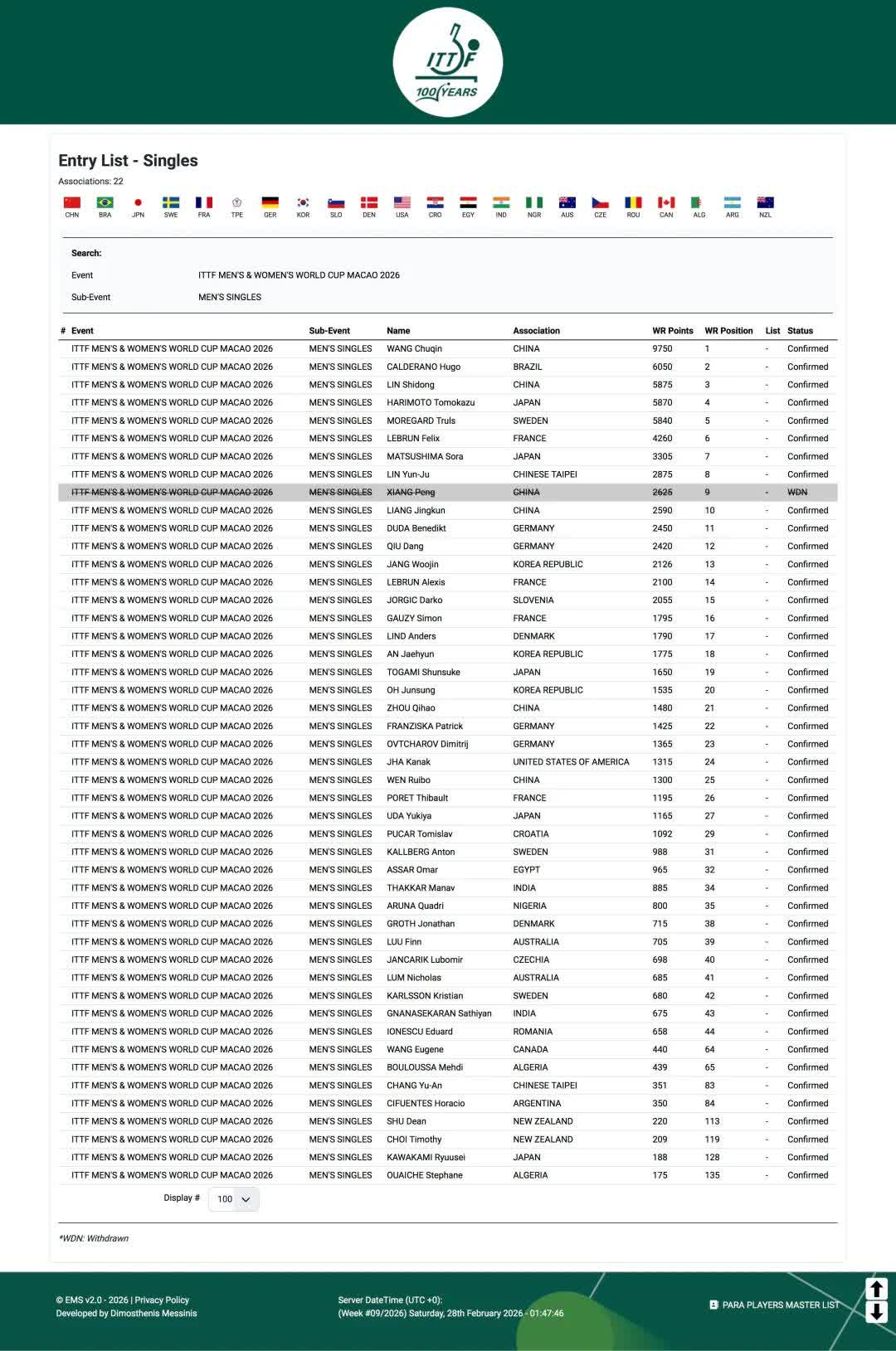大公文匯全媒體報道,2026年乒乓球單打世界盃將於3月30日至4月5日在澳門舉行。據國際乒聯在官網顯示的2026年澳門世界盃參賽名單,國乒將會有5名男單選手和6名女單選手參加本屆單打世界盃。