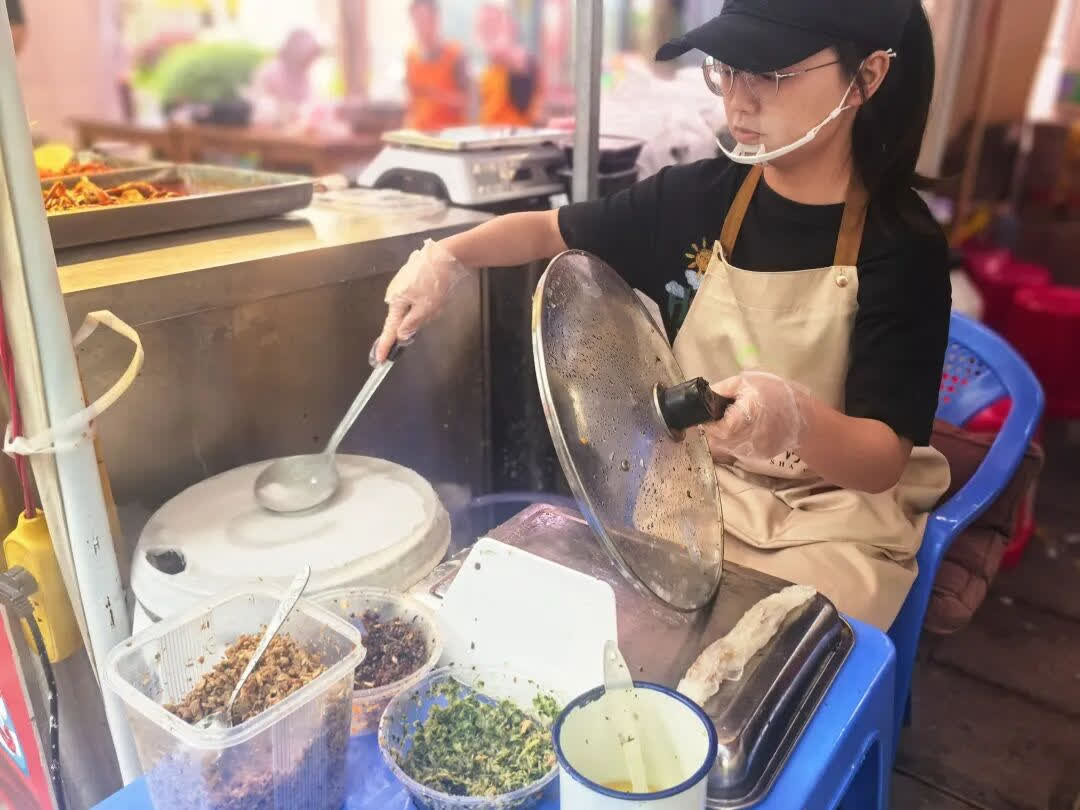在熙熙攘攘的人群中,「婧睿小吃」攤位前排起了長龍,現蒸現做的小卷粉晶瑩剔透,這是小婧的「拿手好戲」。
