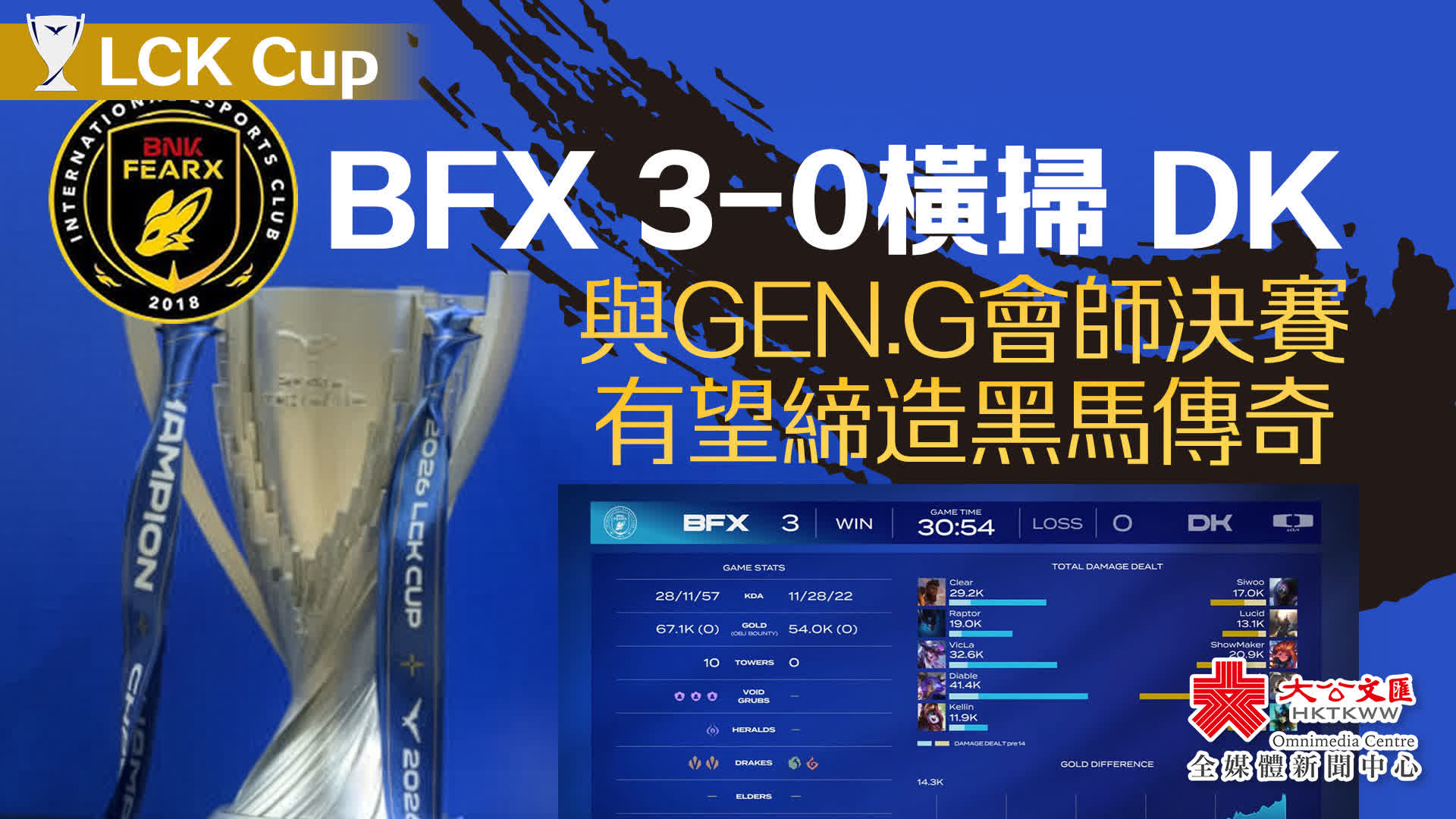 (大公文匯網記者 Rebecca、Charlotte 現場報道)今日(2月28日)晚間,在中國香港啟德競技場舉行的2026 LCK杯決賽晉級賽中,BNK FearX(BFX)以3比0的完美比分橫掃Dplus KIA(DK),不僅成功闖入決賽,更鎖定了即將在巴西舉辦的2026 First Stand賽事入場券。明日(3月1日),BFX將與Gen.G爭奪2026 LCK杯的最終冠軍榮耀。
