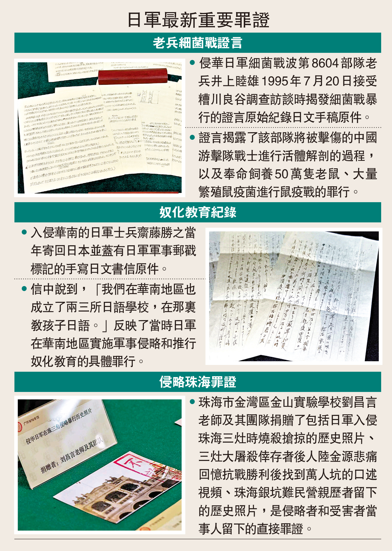 大公報記者從廣東省檔案館獲悉,廣東省社會科學院研究員沙東迅向該館捐贈的檔案中,包括侵華日軍細菌戰波第8604部隊老兵井上睦雄1995年7月20日接受日本民間調查團團長糟川良谷調查訪談時揭發細菌戰暴行的證言原始記錄日文手稿原件、老兵丸山茂1993年公開揭發細菌戰暴行的證言日文鉛印稿等,是日軍侵略罪行的當事人晚年無法抵禦人性煎熬從而留下的自供罪證,言猶在耳,鐵證如山。