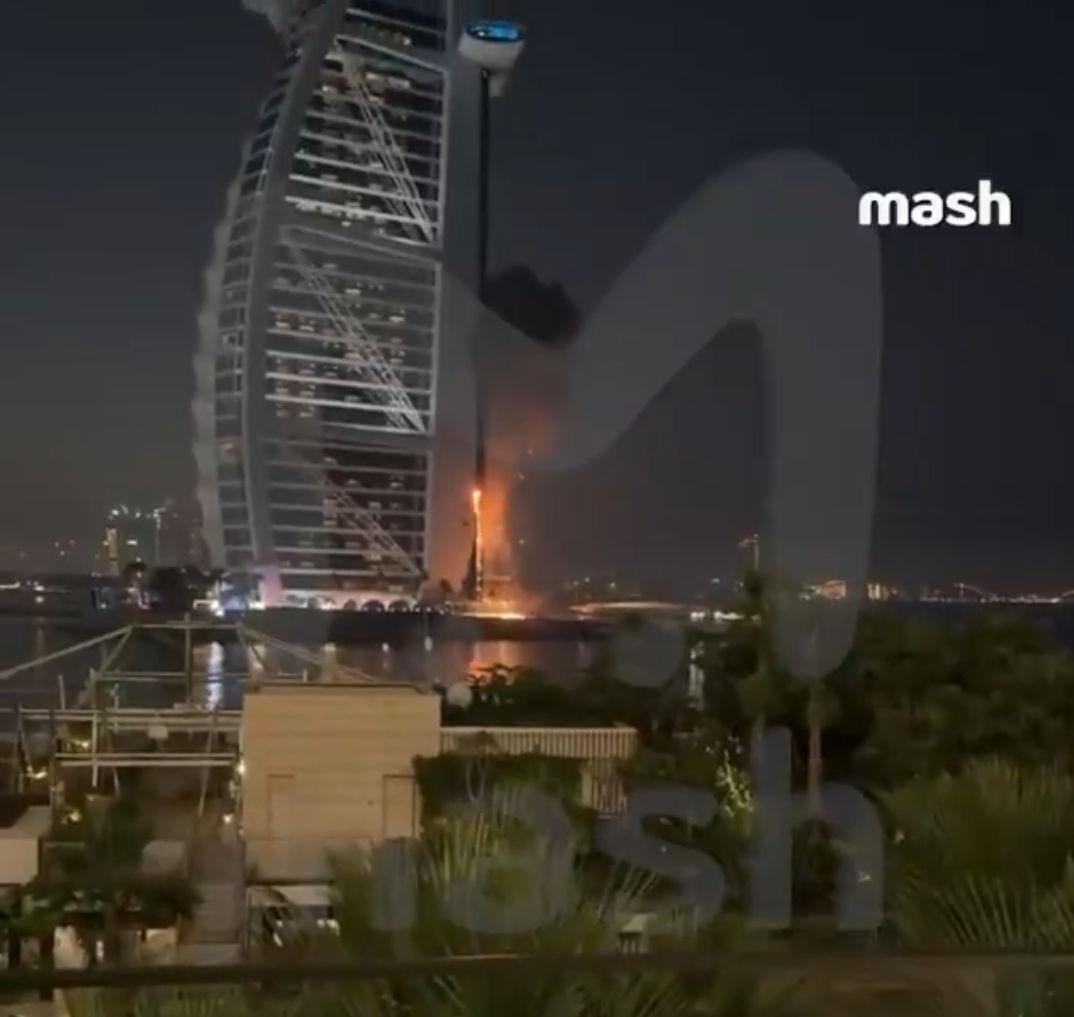 此外,杜拜地標帆船酒店(Burj Al Arab)周邊也傳出因攔截無人機發生火警。網上片段可見,酒店附近火光熊熊,大量黑煙升上半空。