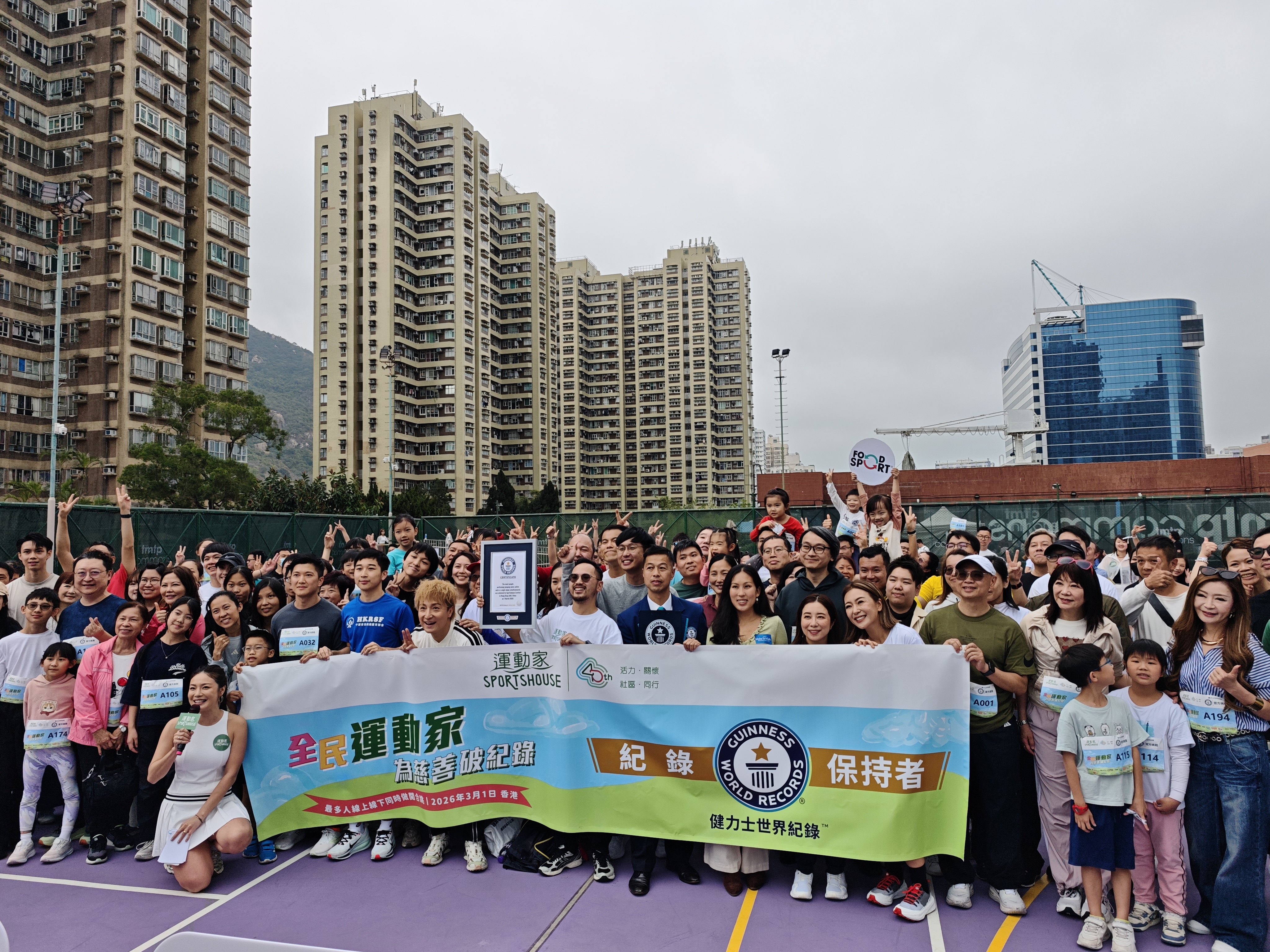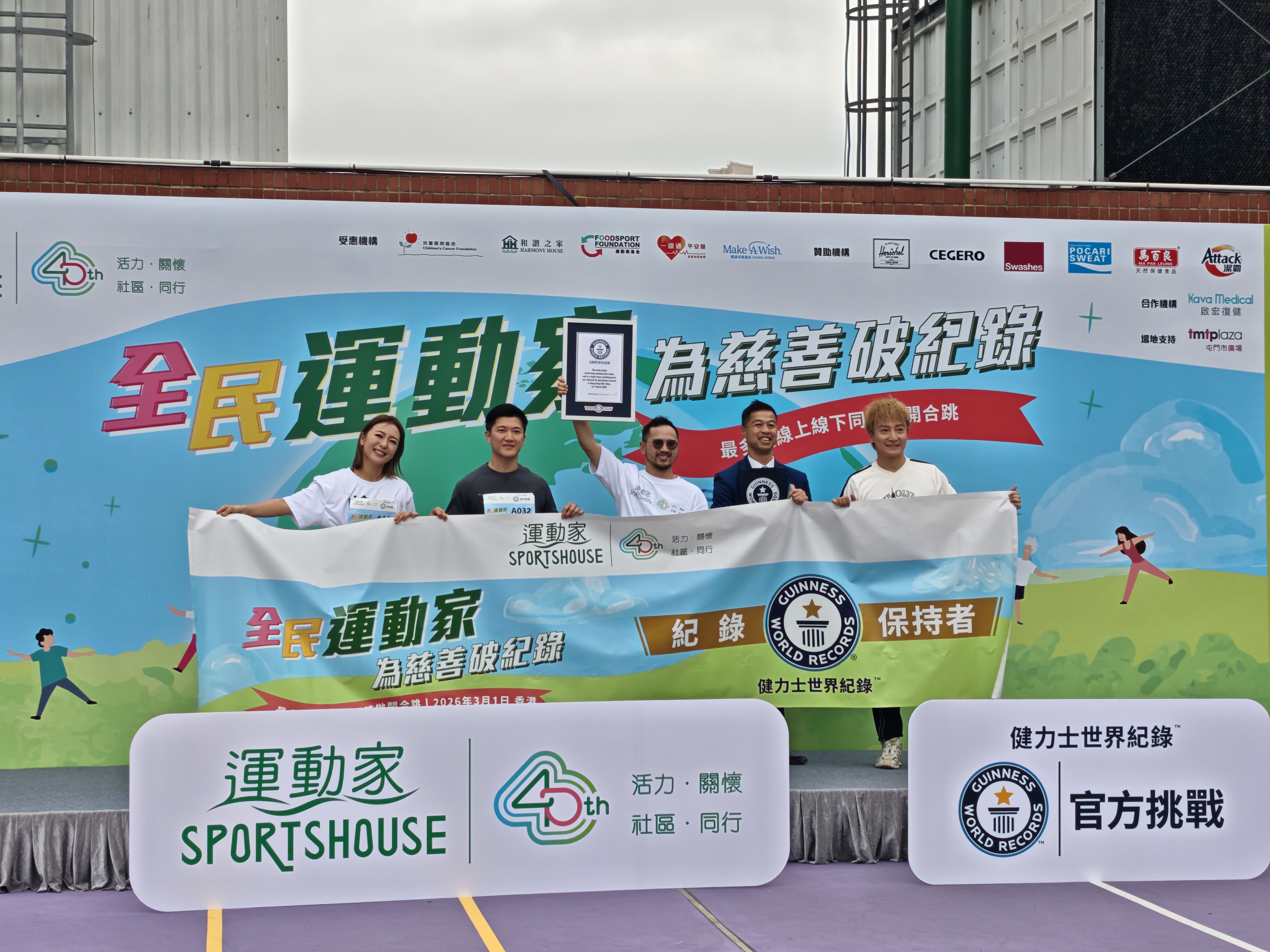 (大公文匯網記者李薇)運動家40周年重點活動「全民運動挑戰日」今日於屯門市廣場舉行,正式挑戰健力士世界紀錄™「最多人線上線下同時做開合跳」。活動以「全民運動家·為慈善破紀錄」為主題,邀請運動員及藝人方力申擔任星級大使,聯同香港跳繩精英運動員戚本熹、花式跳繩世界冠軍郭義德,以及非營利機構「和諧之家」和諧家庭大使梁芷珮(Christy),與市民一同完成同步開合跳世界紀錄。