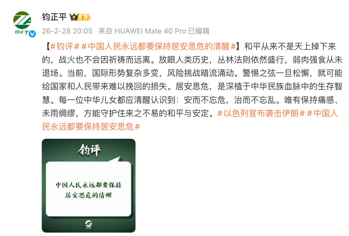 2月28日,鈞正平工作室官方微博發布評論《中國人民永遠都要保持居安思危的清醒》: