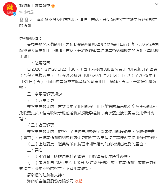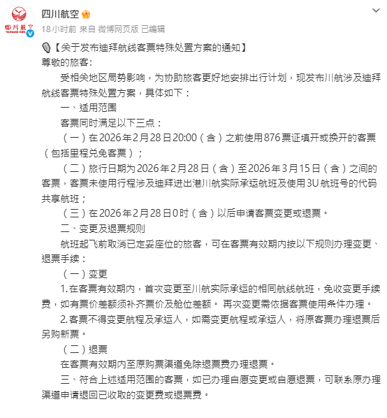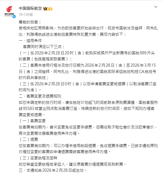 國航通知顯示,旅客於2026年2月28日20時(含)前購買的機票,旅行日期在2026年2月28日至3月15日(均含當日)之間的迪拜、阿布扎比、利雅得進出港航班,可申請變更或退票,首次變更免收手續費,但需補艙位差價。