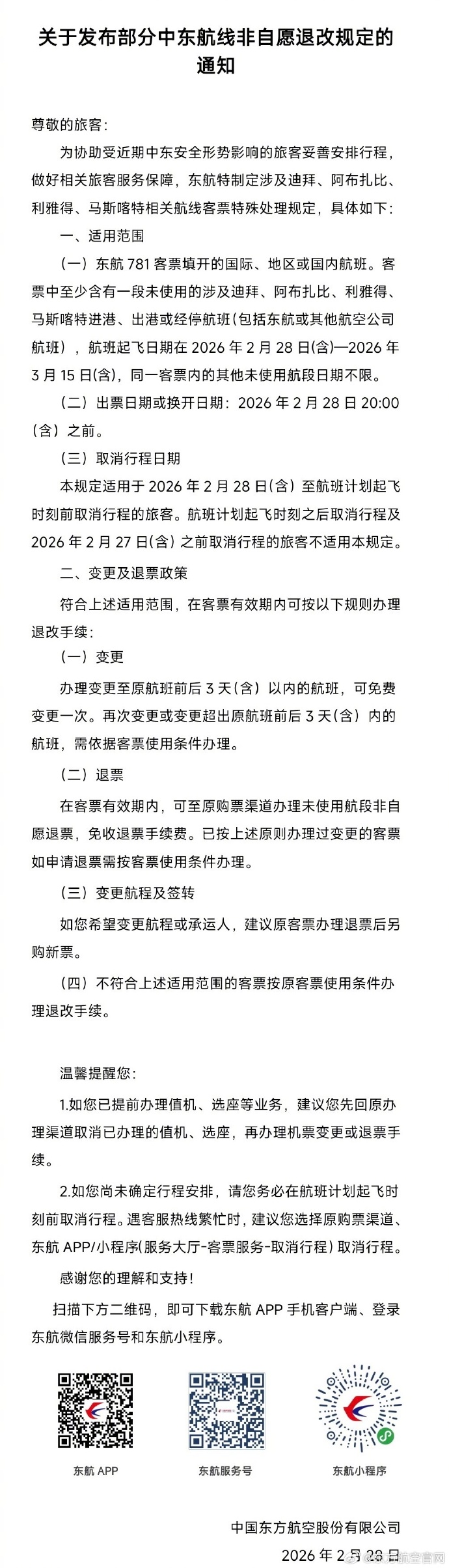 東航規定,旅客購買的機票至少含有一段未使用的涉及迪拜、阿布扎比、利雅得、馬斯喀特的進港、出港或經停航班,航班起飛日期在2026年2月28日(含)至2026年3月15日(含),可免費變更一次至原航班前後3天(含)以內的航班。