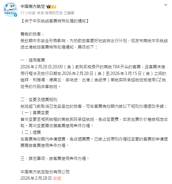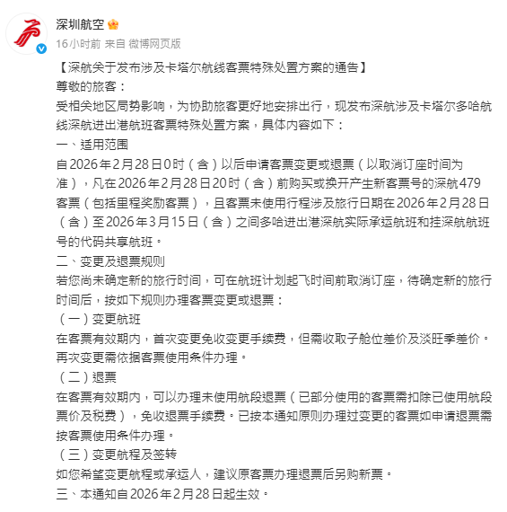 南航方案中,旅客購買的涉及迪拜、利雅得、德黑蘭、多哈的進出港(含經停)航班機票,同樣針對2026年2月28日20:00(含)前購買、旅行日期在2月28日至3月15日之間的機票,可免費變更一次。