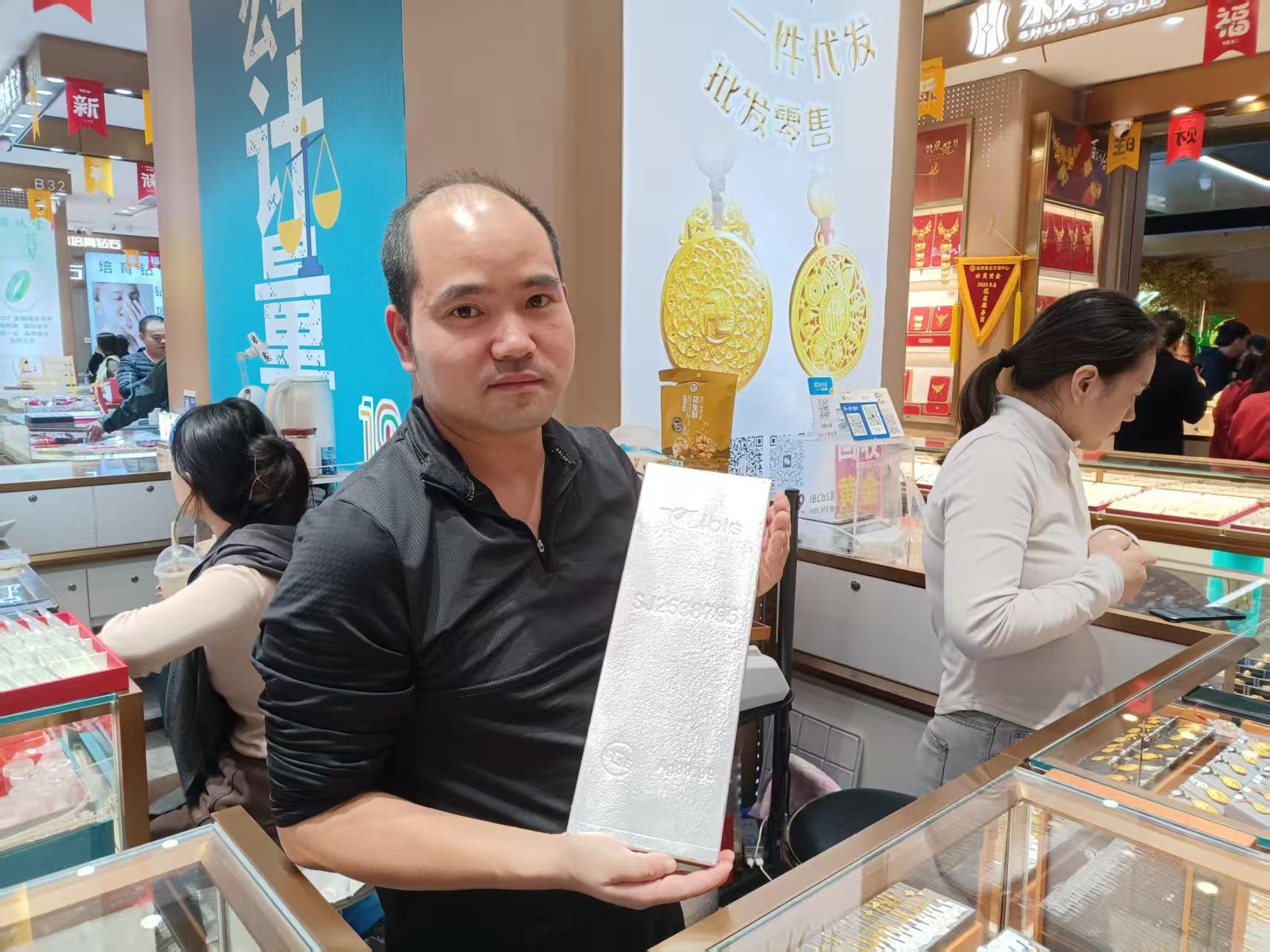 記者採訪深圳流水貝黃金交易中心一商家鼎禎黃金方先生,他表示,今日因中東在打仗,許多避險投資者紛紛前來購買銀條,其中一位投資者前來購買15公斤銀條,25.5元一克,總價近40萬,黃金金條和黃金飾品均銷售了100多克。一些購買首飾的顧客擔心中東打仗將來金價更貴,因此也紛紛趁早入手。