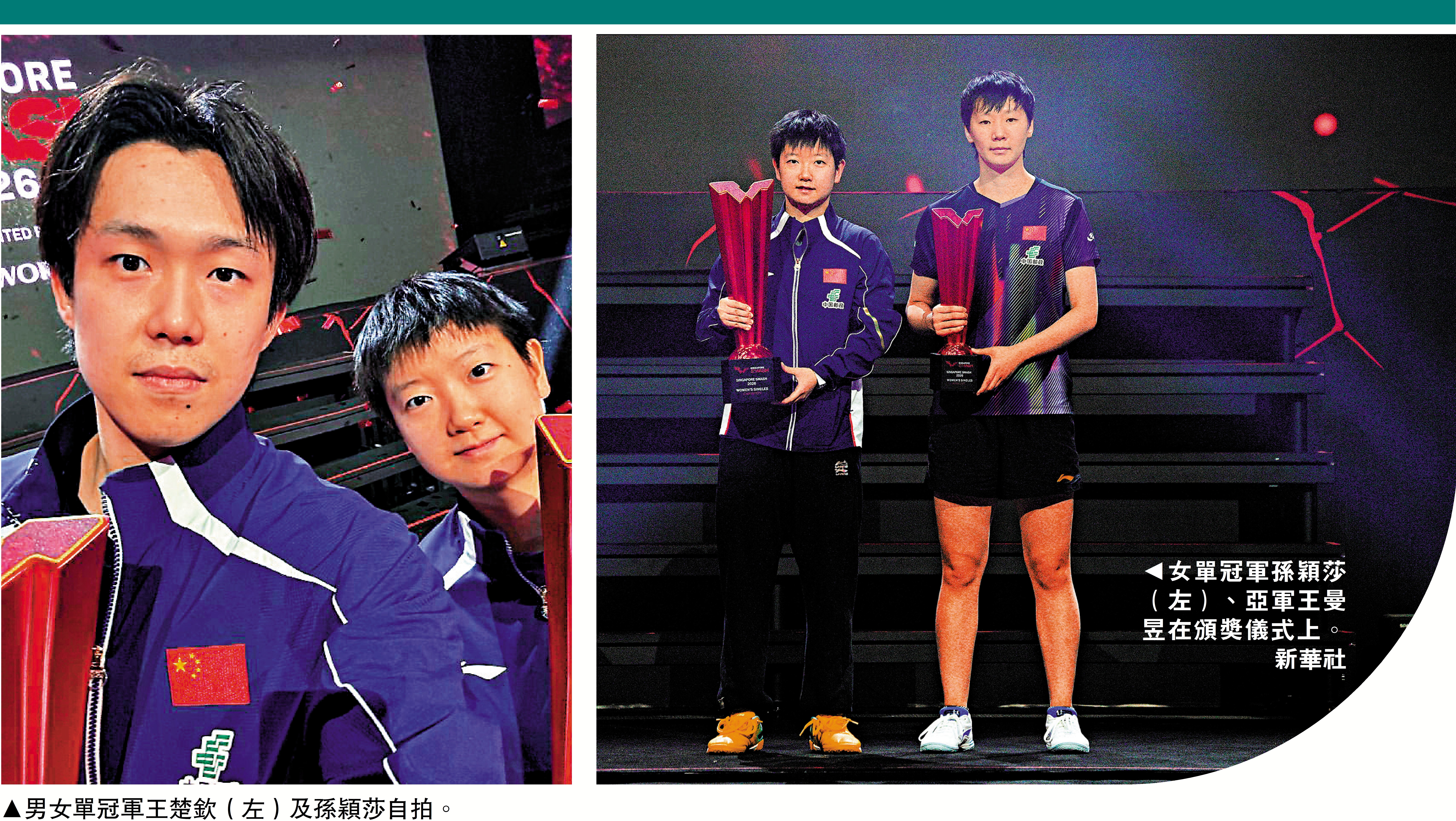 (大公報記者 朱家立)WTT新加坡大滿貫在3月1日分別上演男、女單決賽,國家隊名將、「一姐」孫穎莎率先與王曼昱上演「打吡戰」,最終前者在7局4勝的賽制下以4:2勝出,成功衛冕女單冠軍。至於國家隊「一哥」王楚欽則與中國台北選手林昀儒爭奪男單冠軍,前者發揮穩定之下,直落贏四局輕鬆奪冠。