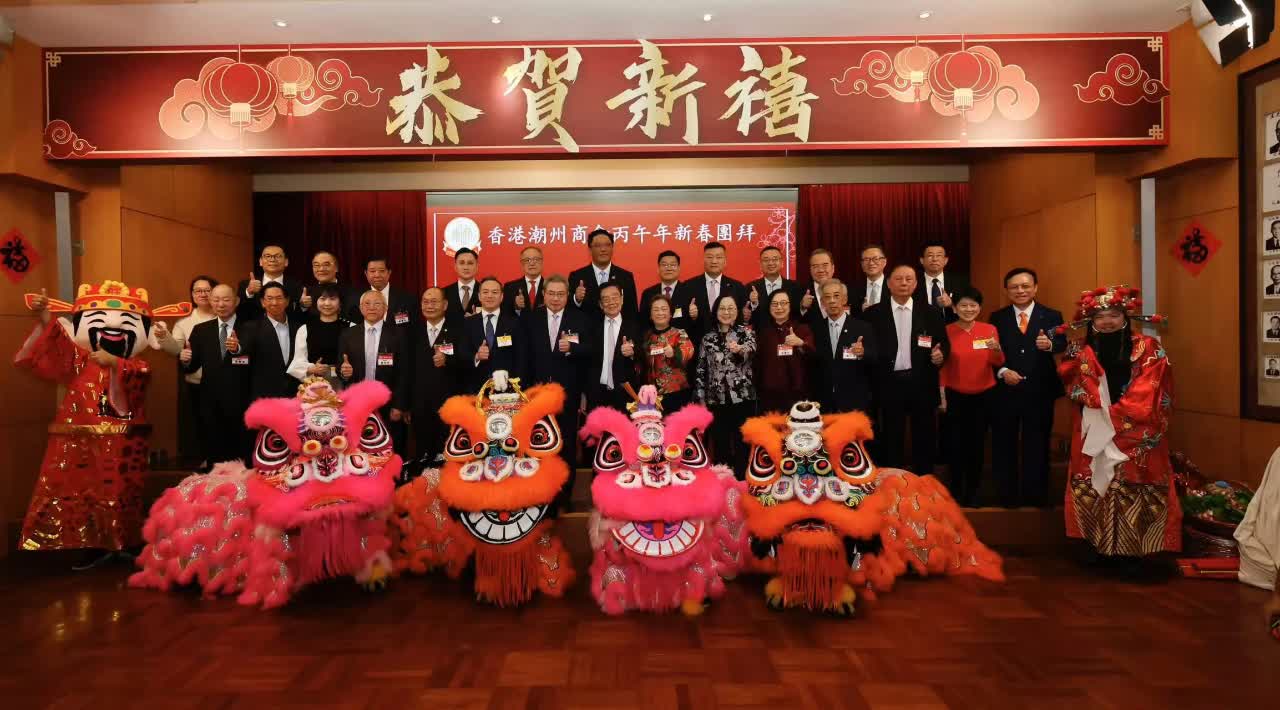 2月24日,香港潮州商會在西營盤會所禮堂舉行新春團拜。民政及青年事務局副局長梁宏正,警務處處長周一鳴,入境事務處處長郭俊峯,中央政府駐港聯絡辦協調部副部長陳澤濤、社團聯絡部副部長胡啟明等主禮。會長高佩璇聯同副會長及首長為醒獅點睛,場面喜氣洋洋。高佩璇介紹過去一年會務時表示,該會共舉辦活動15項、接待來訪20次、組團外訪6次,足跡遍及潮汕、港深及東北,出席國際潮團聯誼年會並推動文化學術交流。該會亦在大埔大火後迅速募集逾3百萬善款,踐行「扶貧救災」宗旨,現正與香港科技大學建立長期合作,弘揚「興學育才」傳統。梁宏正致辭時表示,香港潮州商會作為百年工商團體,一直秉持「敦睦鄉誼、促進工商、服務社會」宗旨。踏入2026年,特區政府將首次制訂香港五年發展規劃,帶領香港做好「超級聯繫人」與「超級增值人」雙重角色,積極對接國家「十五五」規劃。