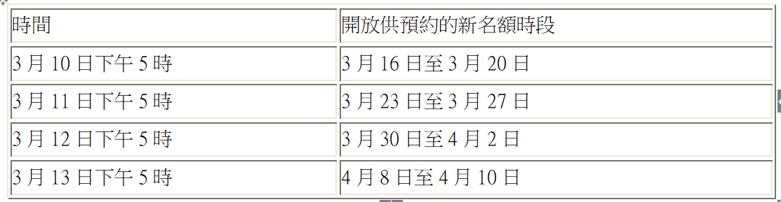 而由3月16日起,系統會開放未來4星期可預約的名額,並於每個工作日下午5時更新名額。
