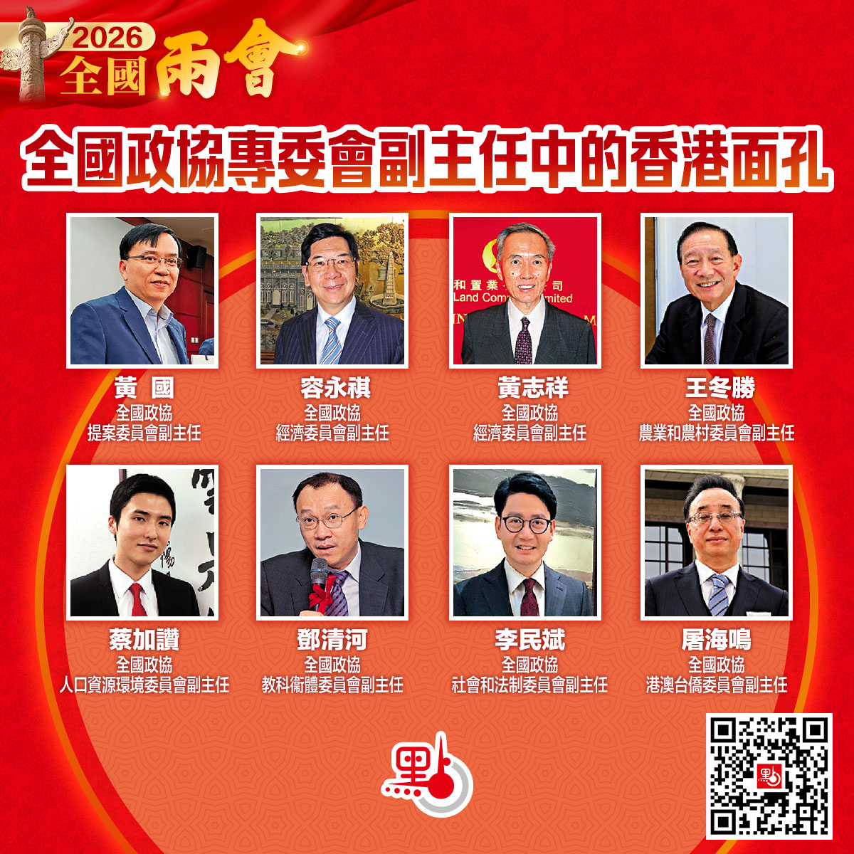 (大公文匯全媒體記者 蘇鉅祖) 2026年全國兩會即將召開,十四屆全國人大四次會議將於3月5日開幕,全國政協十四屆四次會議將於3月4日開幕。港區全國人大代表和全國政協委員即將赴京參會。大公文匯全媒體製作了《全國政協專委會副主任中的香港面孔》,快來睇下!