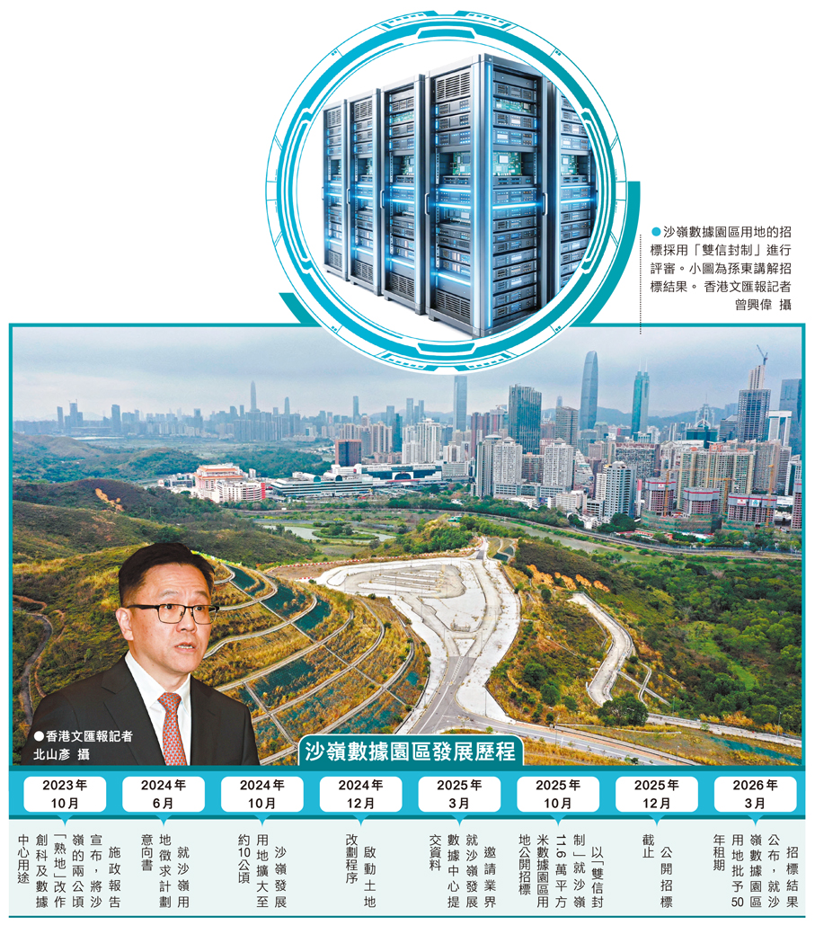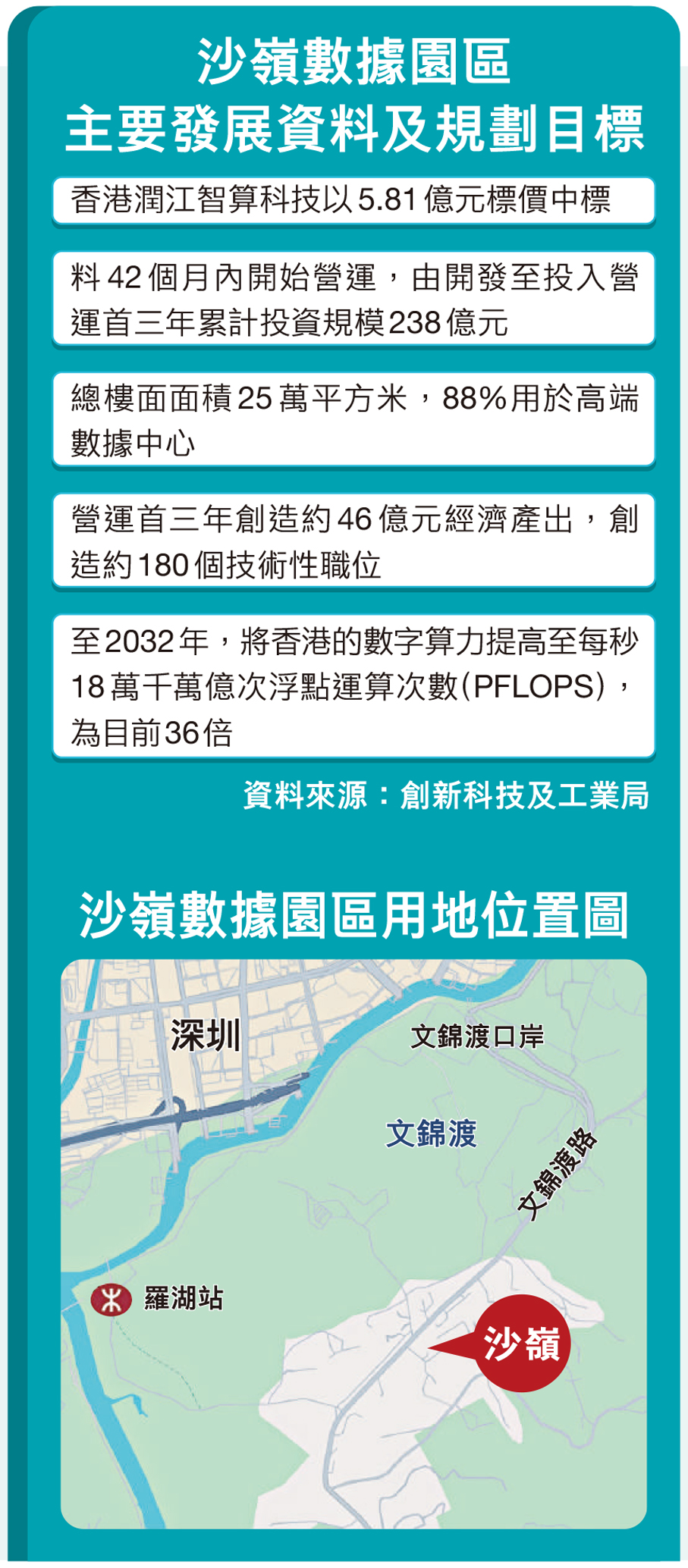 (香港文匯報記者 楊盈盈)今年是國家「十五五」規劃的開局之年,在這關鍵的節點,香港特區政府積極對接國策,其中重要一步是向建設國際創新科技中心的目標全力邁進。創新科技及工業局昨日公布位於新界北區、總面積超過11萬平方米的沙嶺數據園區用地之招標結果,由香港潤江智算科技有限公司以5.81億元中標,批租期為50年,該公司承諾從開發至投入營運的首三年,累計投資規模達238億元;政府預計園區投入營運首三年可帶來約46億元經濟產出,創造約180個技術性職位,同時大幅擴充本港數據及算力基礎設施,為人工智能(AI)及數字經濟提供更扎實的底盤,料2032年相當於目前香港算力的36倍,目標是推動科研突破和AI技術在產業與社會的廣泛應用。