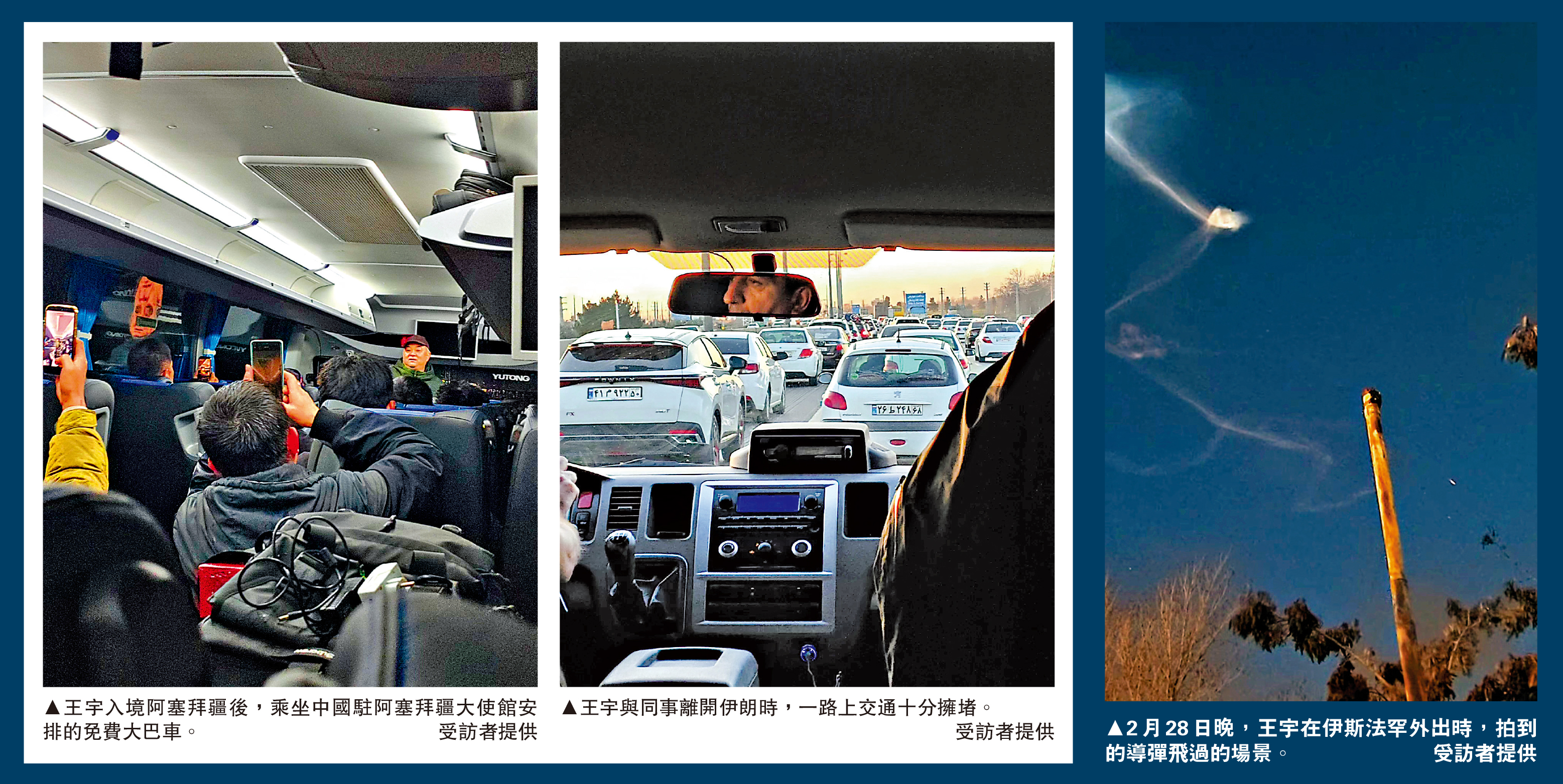 本港時間3月1日上午9時15分左右,王宇使用伊朗本地手機向女朋友小庭撥通衛星電話,告知正準備出發前往伊朗─阿塞拜疆邊境阿斯塔拉口岸。2日凌晨6時33分,小庭告訴記者,王宇已平安抵達阿塞拜疆。下午4時左右,王宇與記者恢復聯絡,講述了他14個小時撤離伊朗的驚險歷程。