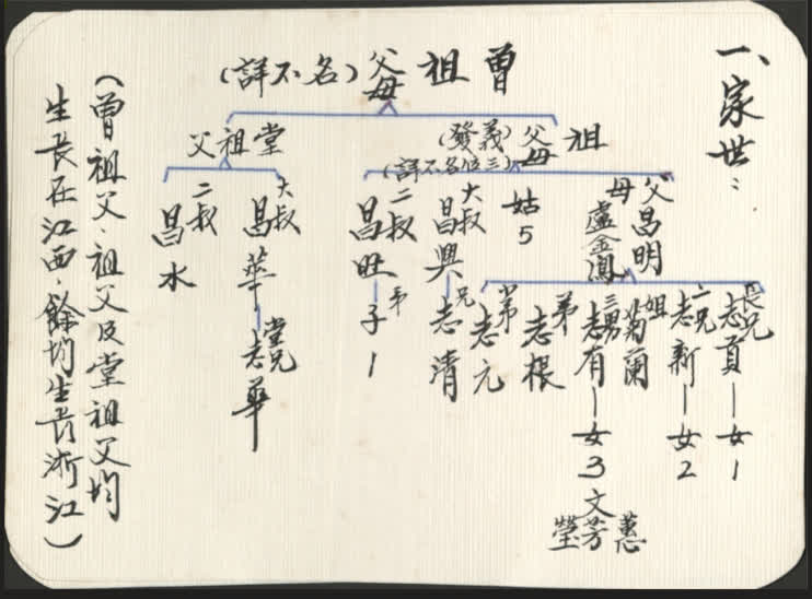 1949年,22歲的童志有從江西上饒祝同中學隨校赴台,從此與大陸親人海峽相隔77年。「回鄉尋根祭祖」成為老人畢生最大的心愿,每到清明節,童志有總帶着母親和女兒,在家門口遙望故鄉祭祖。童志有無時無刻思念着家鄉親人,他手寫家譜,記錄每一位他記得的血脈親人,旁註中講述了父母疼愛他、支持他,培養他讀書、教養他成人的過程。