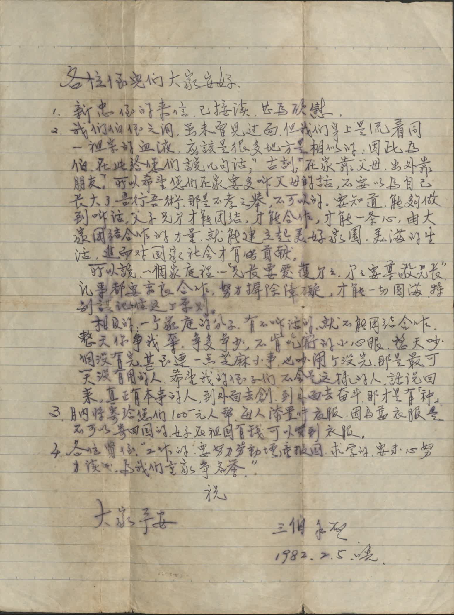 這封家書的開頭是這樣寫的:我們伯侄雖然從未曾謀面,但是我們流着的是相同的血脈。「這句話很重要。」童愛甯說,「我們都流着相同的血脈,為什麼要分開兩地呢?」她說,把這封家書捐出去,是想告訴更多人,你必須知道你從何而來?根在哪裏。