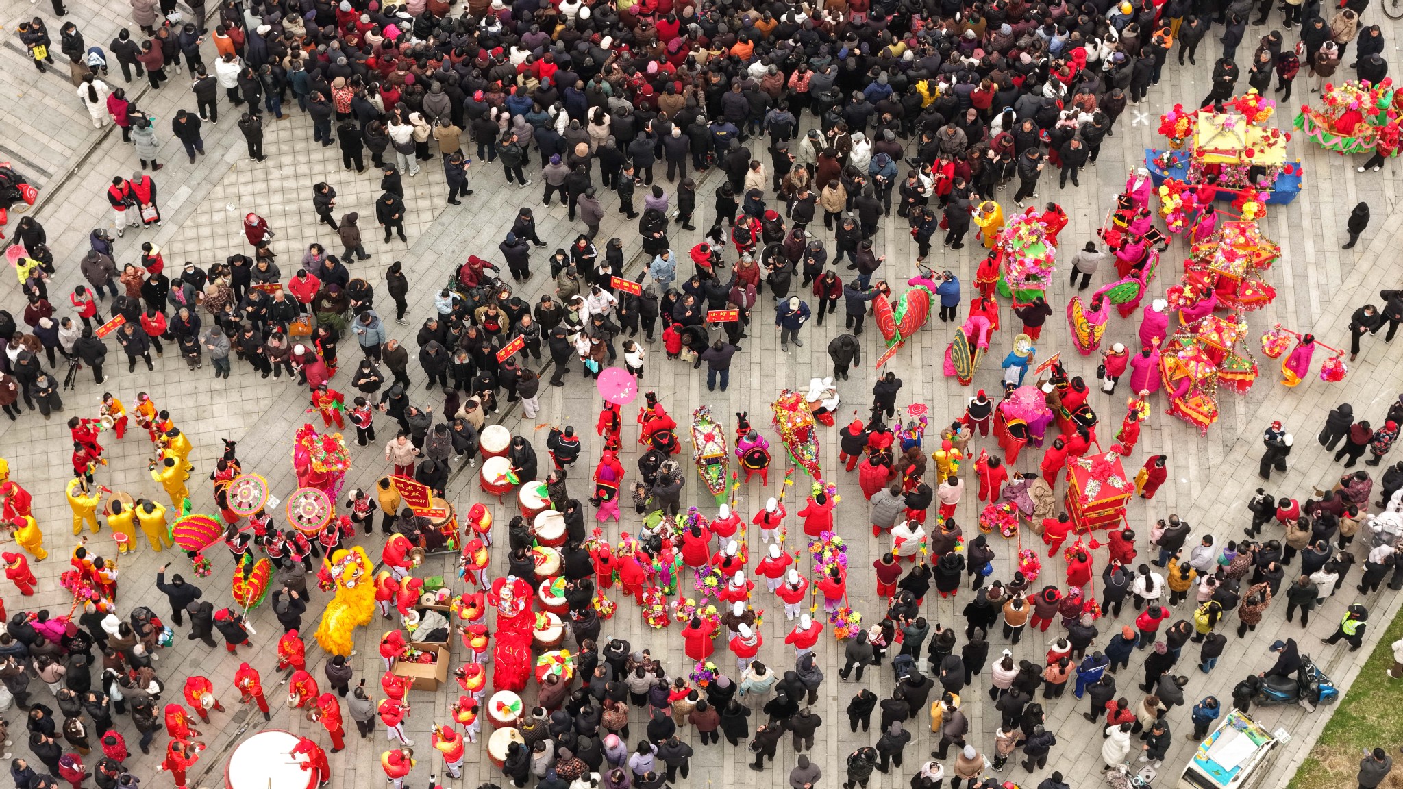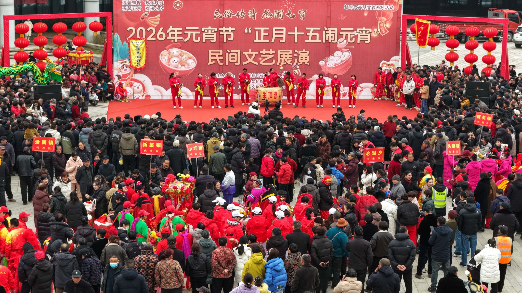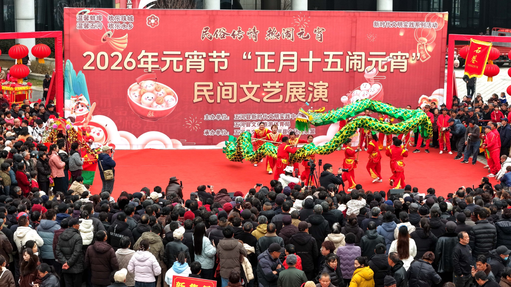 3月3日,農曆馬年正月十五元宵節,安徽省五河縣以「民俗傳情・熱鬧元宵」為主題,在新時代文明實踐中心廣場舉辦民間文藝展演,10支隊伍通過舞龍、耍獅、劃旱船、花鼓燈、花挑等非遺節目,搭配猜燈謎等互動,以廣場展演與踩街形式鬧元宵,盡顯皖北水鄉的民俗年味。