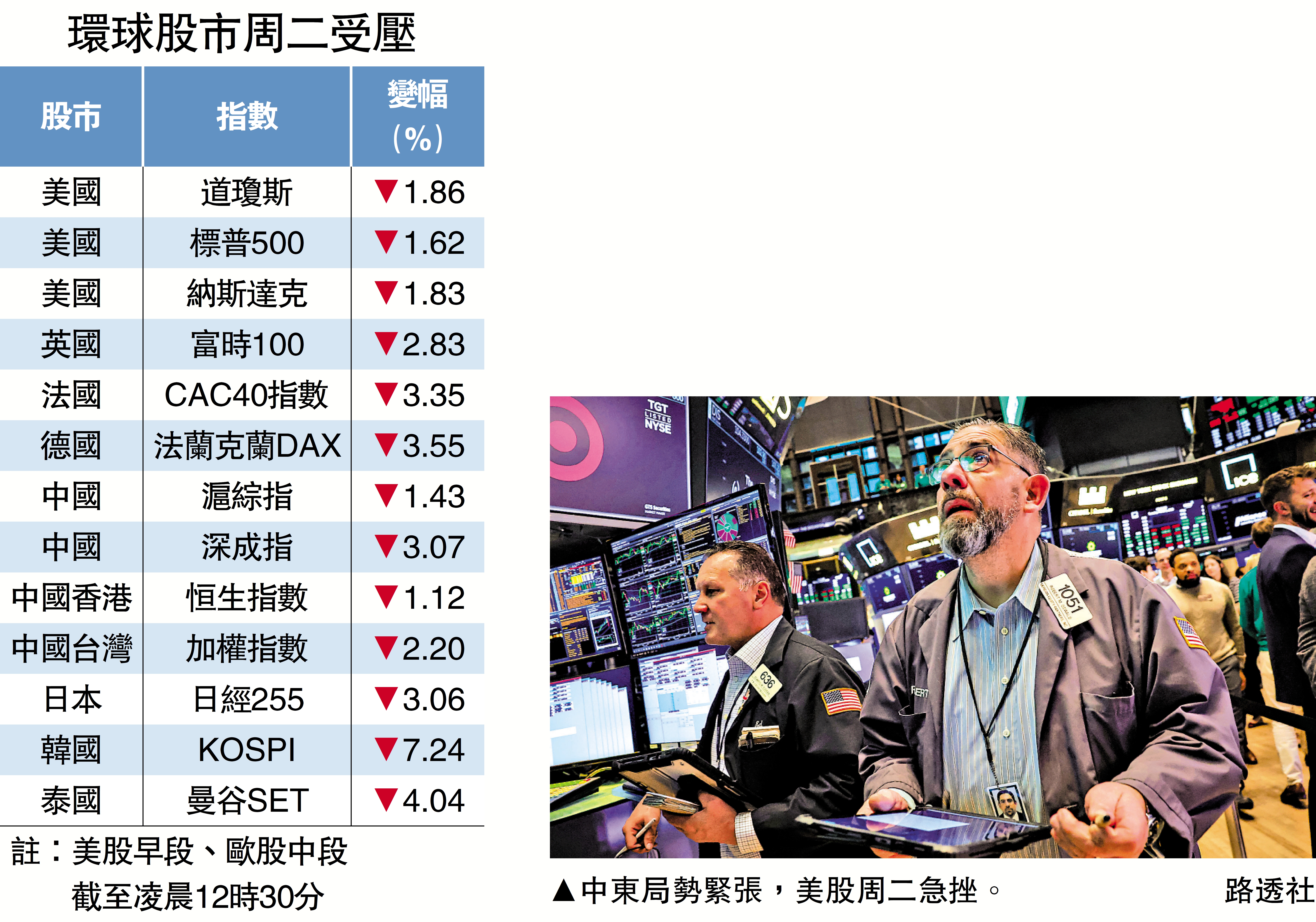 大公報綜合報道,中東局勢持續緊張,油價大升,引發環球股災,歐美股市周二急跌。美股三大指數早段跌逾2%,道指曾瀉2.61%或1277點,低見47626點。英法德股市挫逾3%,反映歐股整體表現的斯托克歐洲600指數跌逾3%,主要是油價上升將導致歐洲生活成本急增。