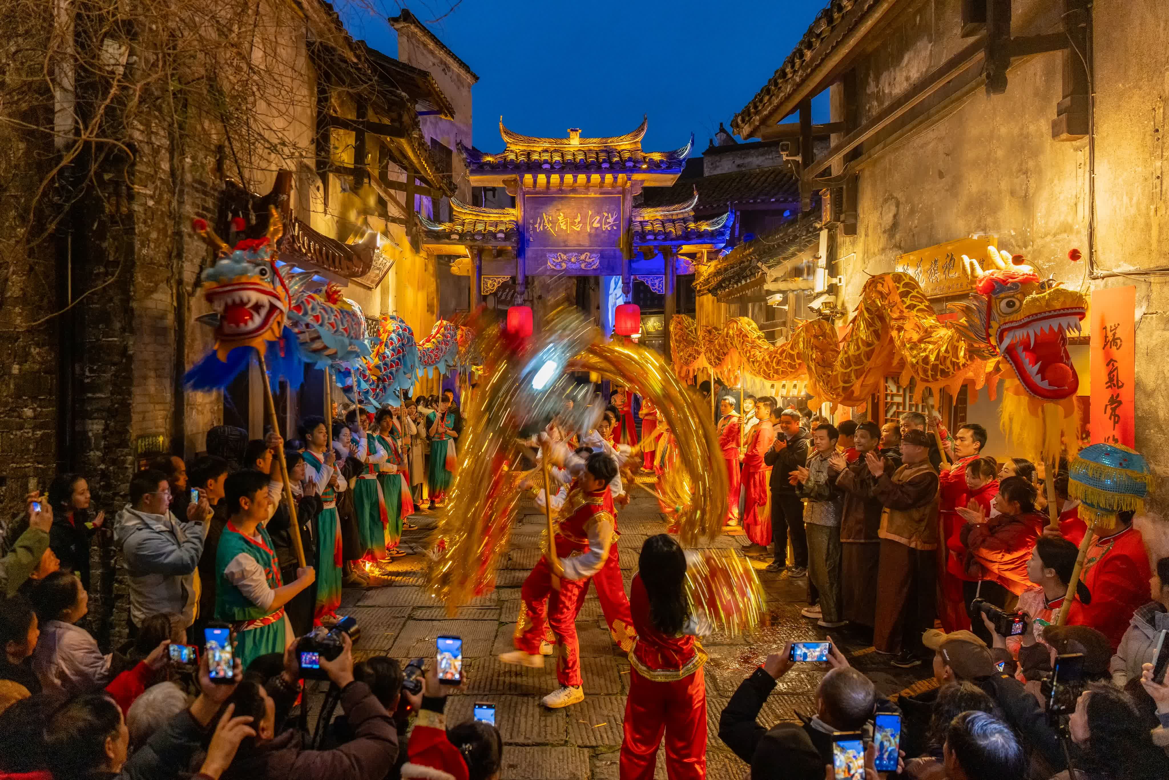 暮色降臨,洪江古商城被璀璨燈火點亮。晚上7時,「元宵喜送龍」活動拉開帷幕。夜色中,27支龍隊從城區各處出發,沿着街巷向洪江區體育廣場匯聚,所到之處,便是一片歡樂的海洋。今年的「元宵喜送龍」活動,進一步增強了民俗互動體驗,吸引了各地遊客紛至沓來。