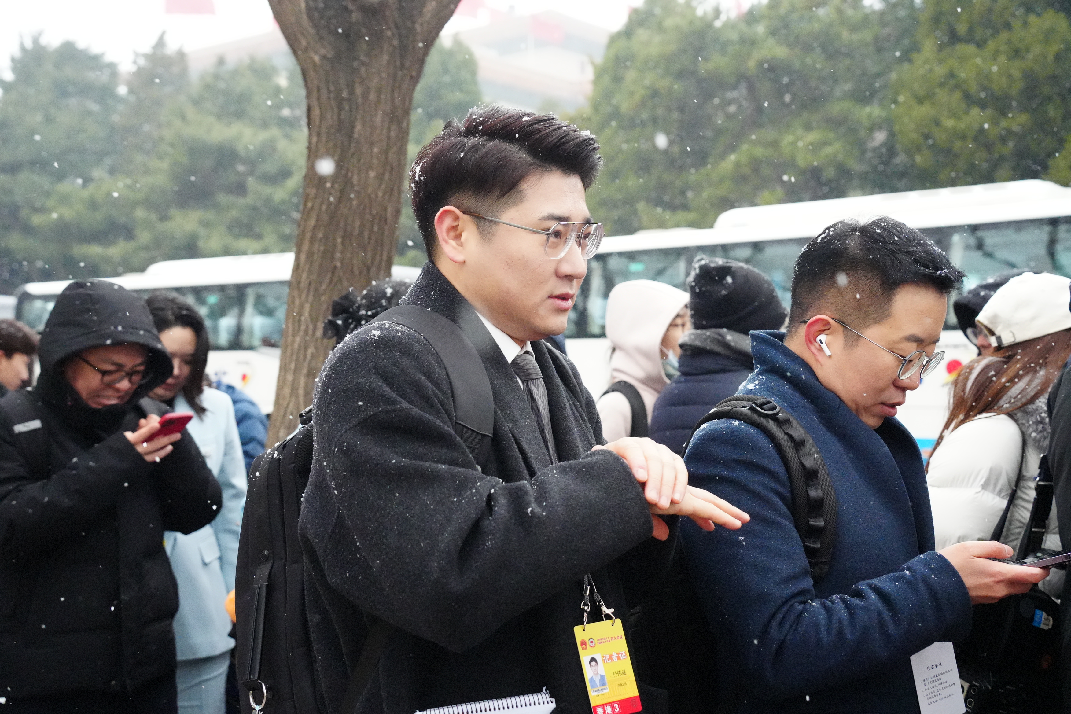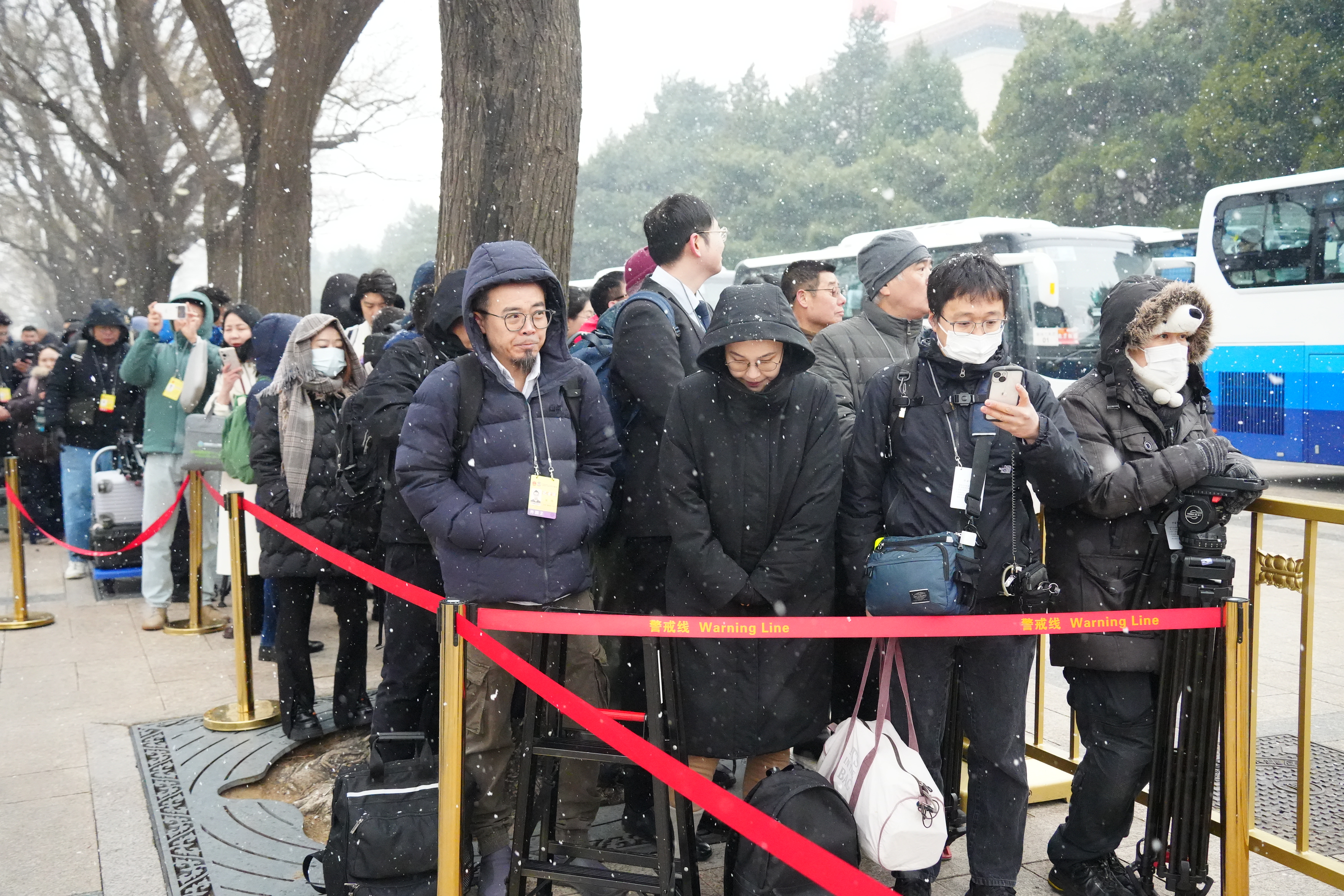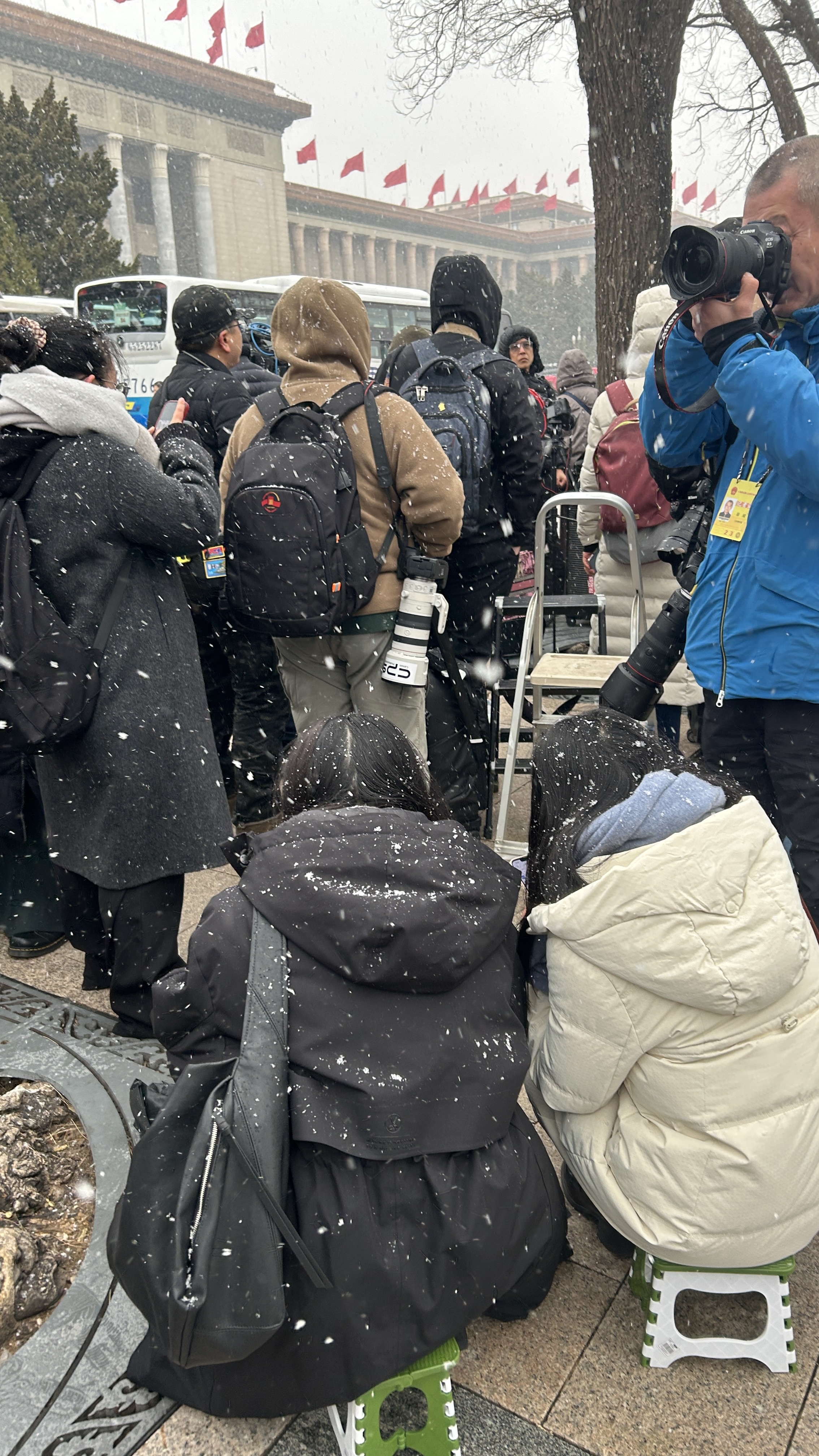 今日上午11時許,大公文匯全媒體記者在人民大會堂外看到,天空中飄起鵝毛大雪,雪愈下愈大,許多媒體從業者在外等候入場,頭髮上與背包上落滿了雪。除此之外,場外的武警官兵、交警與軍犬亦在雪中守護秩序。