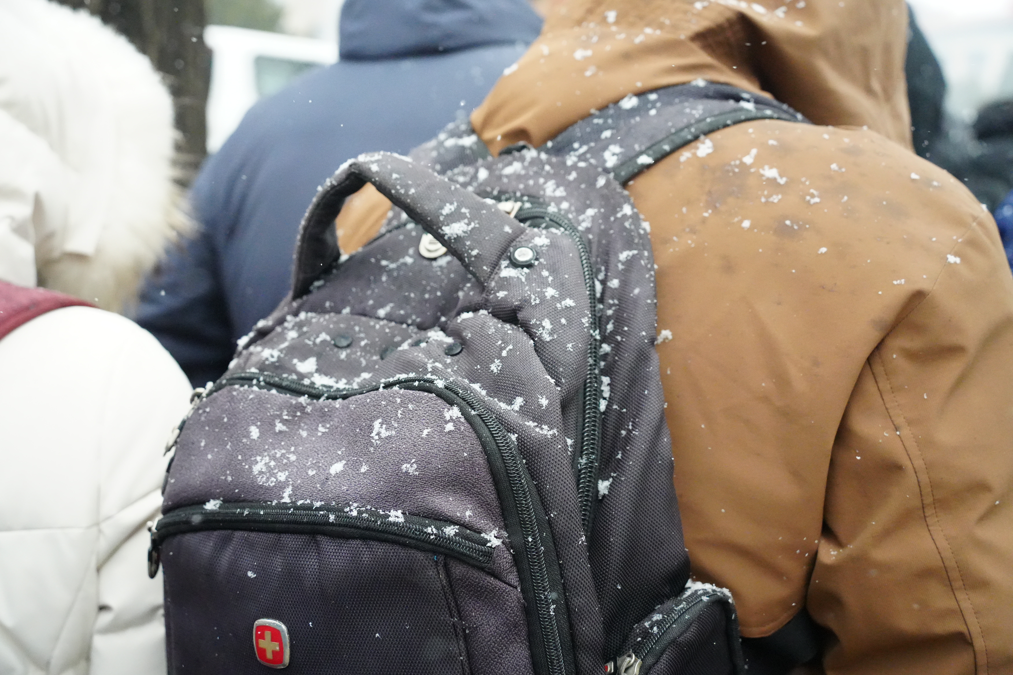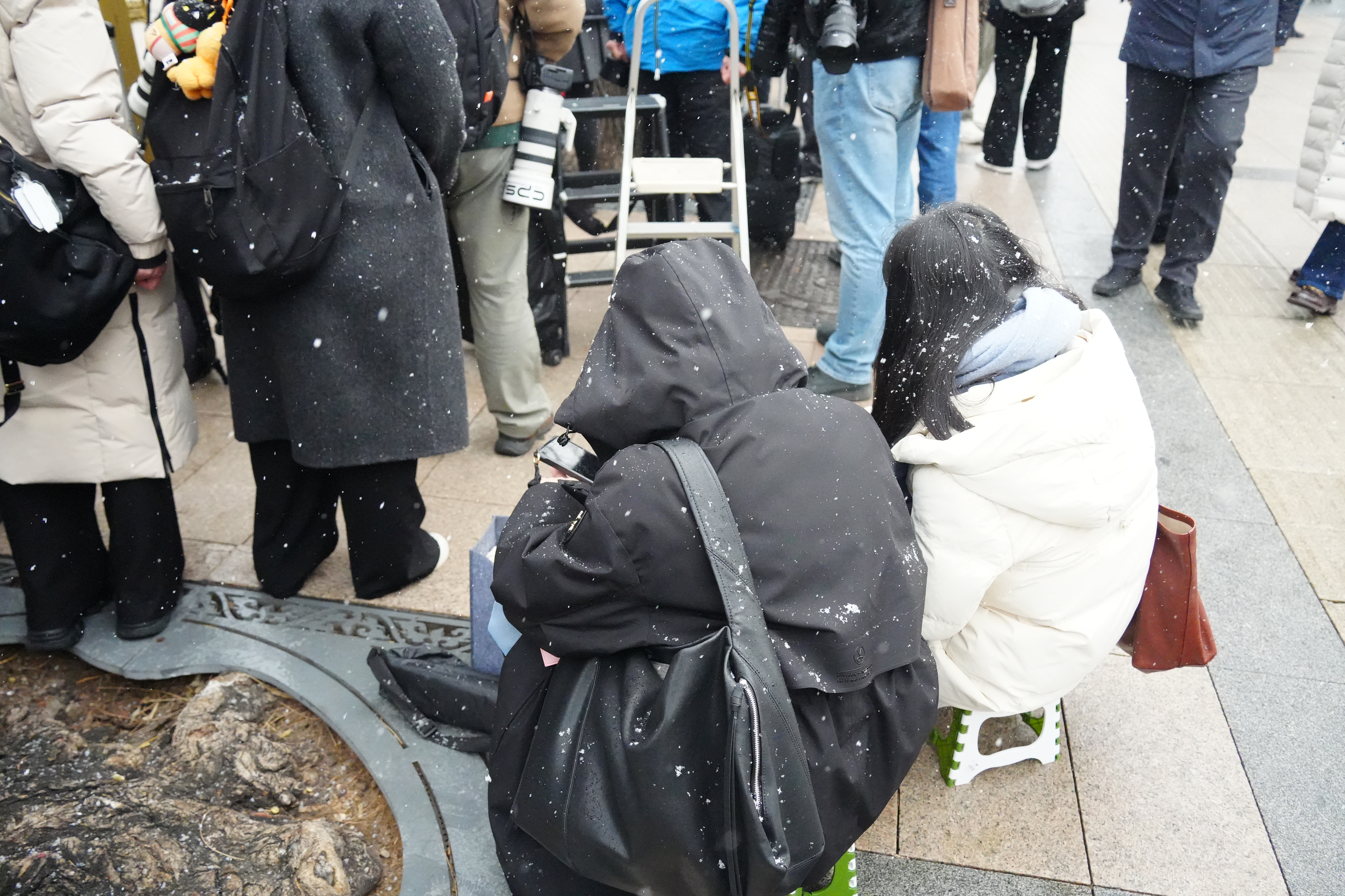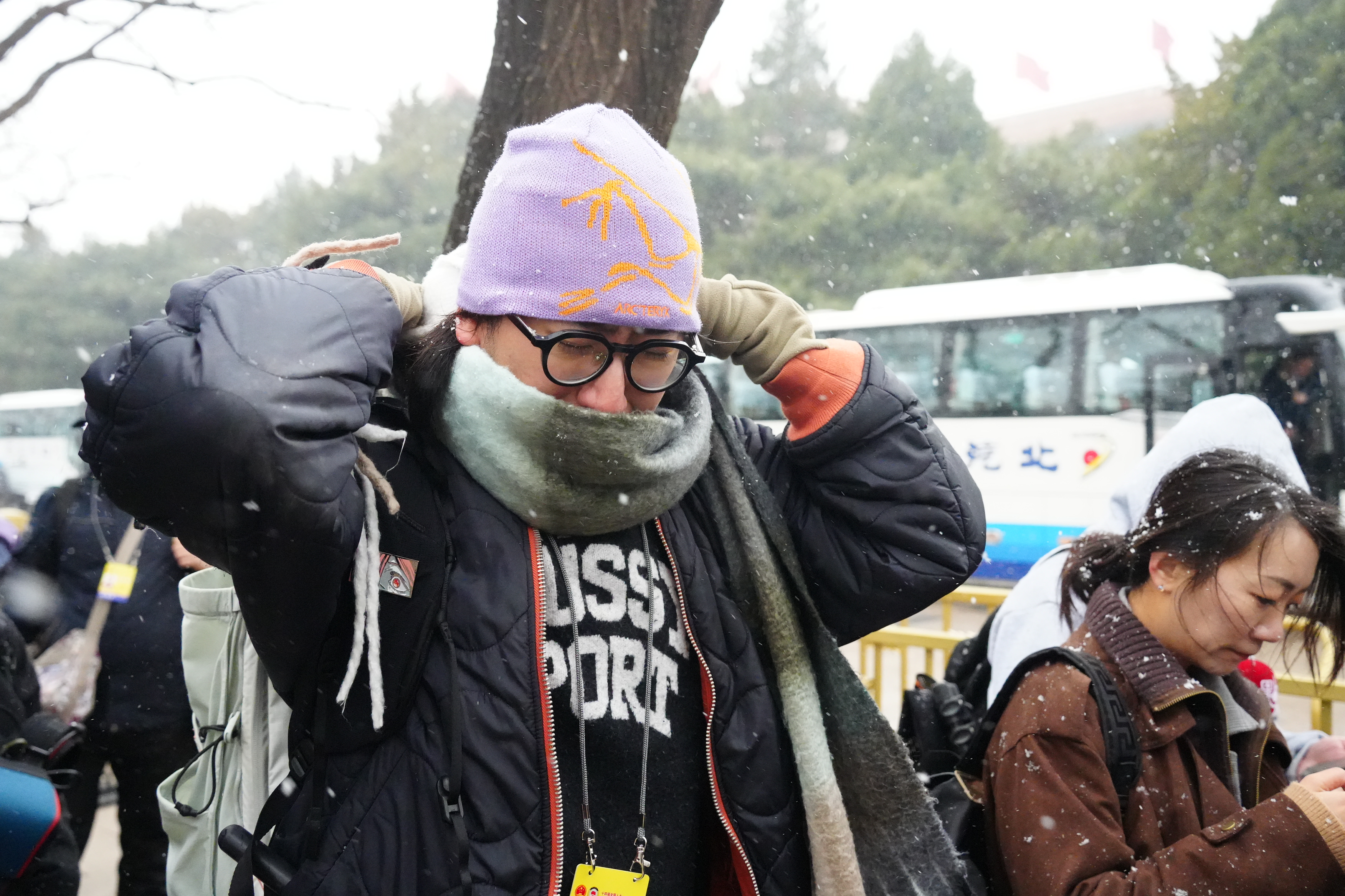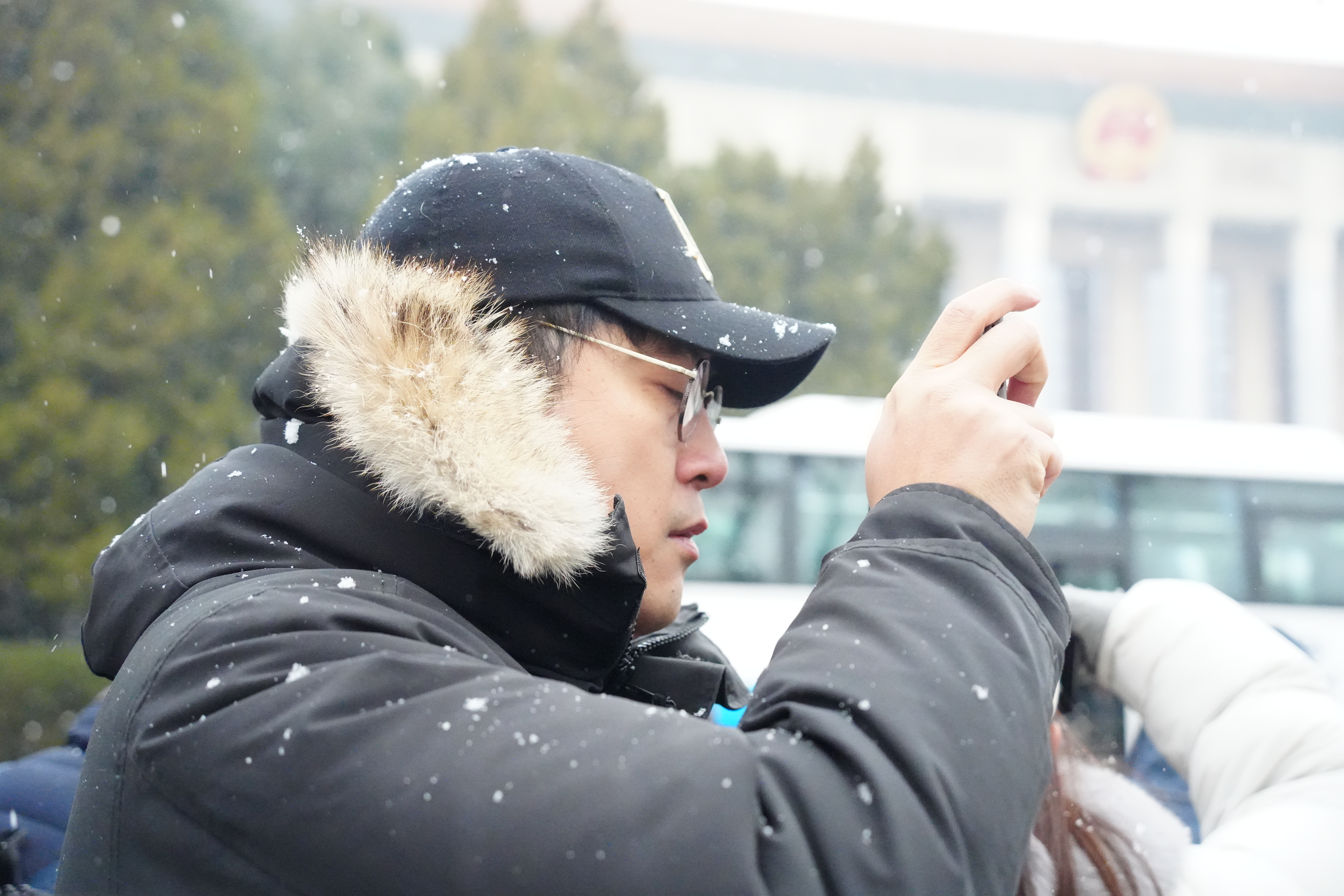 今日上午11時許,大公文匯全媒體記者在人民大會堂外看到,天空中飄起鵝毛大雪,雪愈下愈大,許多媒體從業者在外等候入場,頭髮上與背包上落滿了雪。除此之外,場外的武警官兵、交警與軍犬亦在雪中守護秩序。