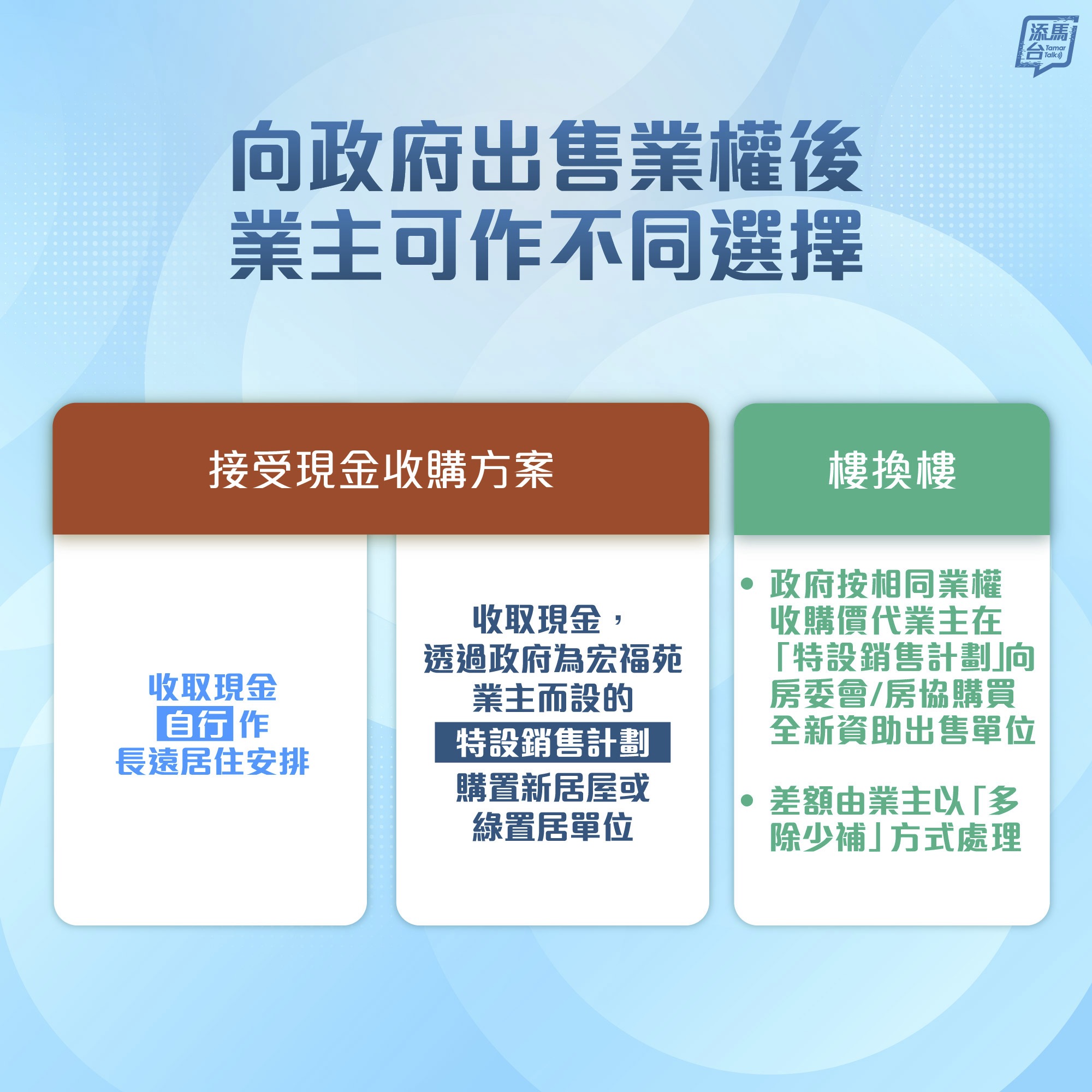 協助選擇「樓換樓」選項的宏福苑按揭抵押人及借款人,以其所購買的全新資助出售單位取代原有宏福苑單位作為按揭抵押品。按揭銀行同意在完成抵押品轉換後,該按揭貸款的條款(包括供款息率及期數)將不遜於現有按揭貸款。