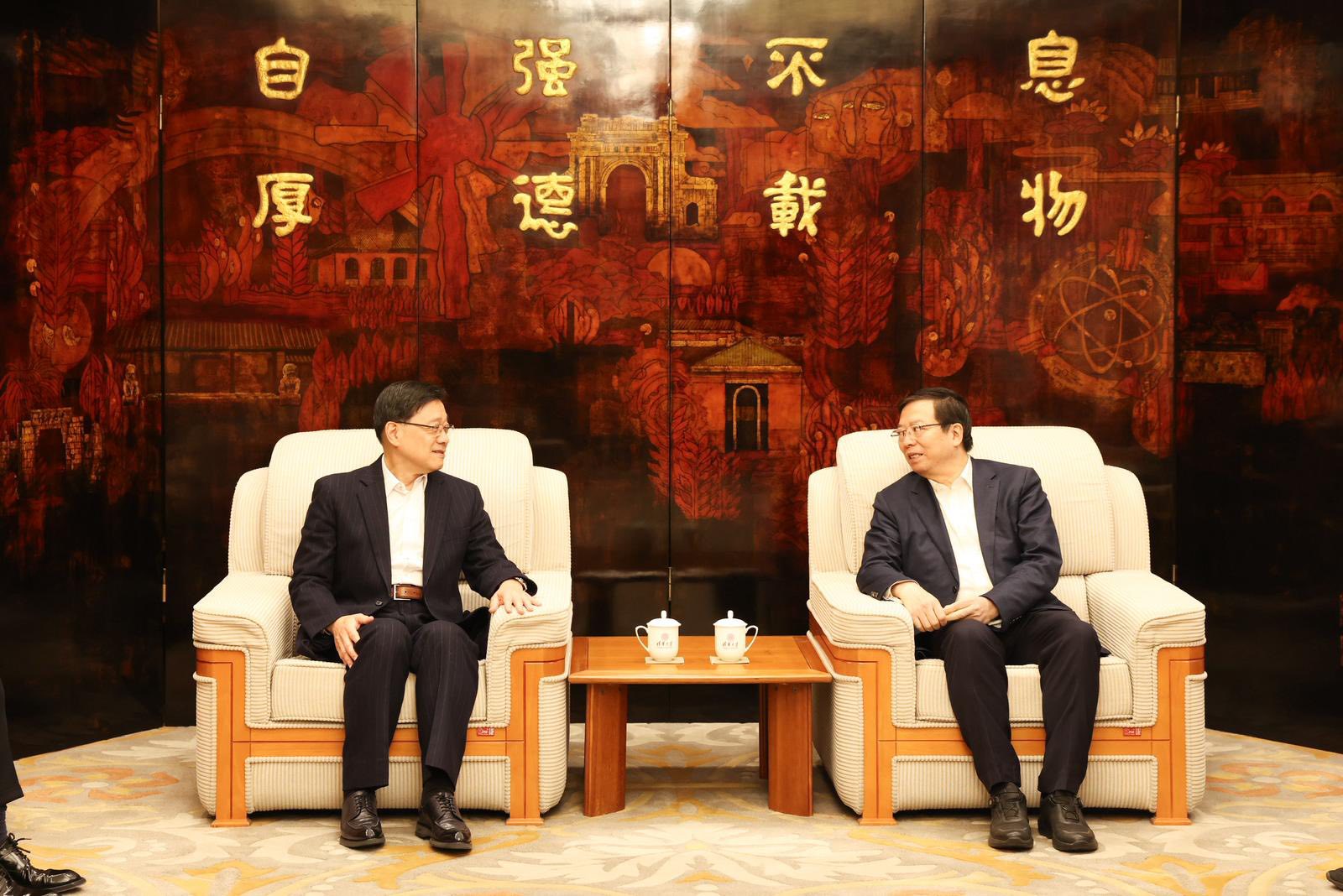 李家超下午與清華大學黨委書記邱勇教授會面,就共同關心的議題交流意見。李家超表示,特區政府提速推進北部都會區(北都)發展,已預留約90公頃土地,建設北都大學教育城。他歡迎作為國家頂尖大學的清華大學把優勢學科和課程帶到大學城,實現協同發展。特區政府會繼續積極推動香港與內地高等院校緊密合作,他期待清華大學與香港高校繼續通過京港大學聯盟深化合作,進一步促進兩地大學在人才培養和科學研究領域的優勢互補。