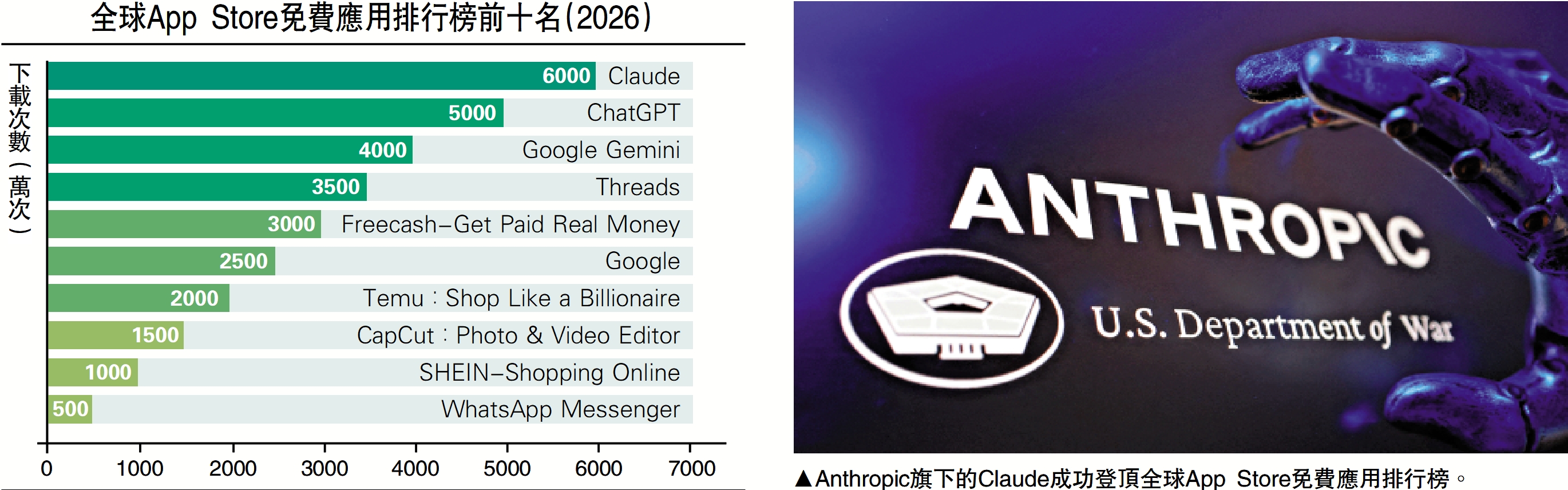 與此同時,一場名為「QuitGPT」的抵制運動在美國社交媒體上蔓延。大批用戶從ChatGPT轉投Claude,並造成後者服務過載出現宕機。2月28日,Claude成功登頂全球App Store免費應用排行榜,將ChatGPT擠到了第二位(見配表)。