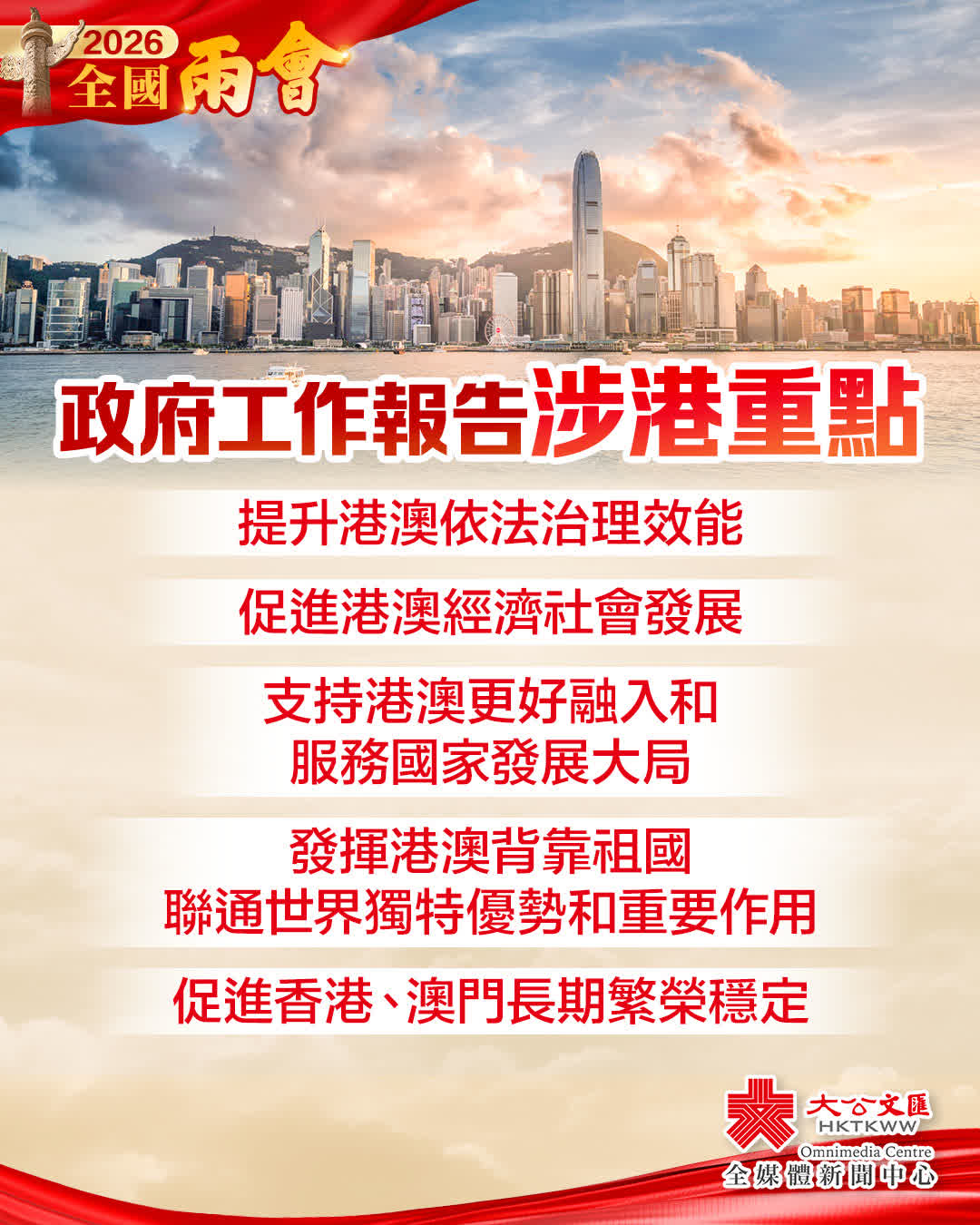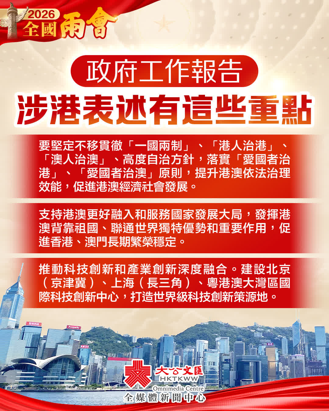 政府工作報告強調,要堅定不移貫徹「一國兩制」、「港人治港」、「澳人治澳」、高度自治方針,落實「愛國者治港」、「愛國者治澳」原則,提升港澳依法治理效能,促進港澳經濟社會發展。支持港澳更好融入和服務國家發展大局,發揮港澳背靠祖國、聯通世界獨特優勢和重要作用,促進香港、澳門長期繁榮穩定。