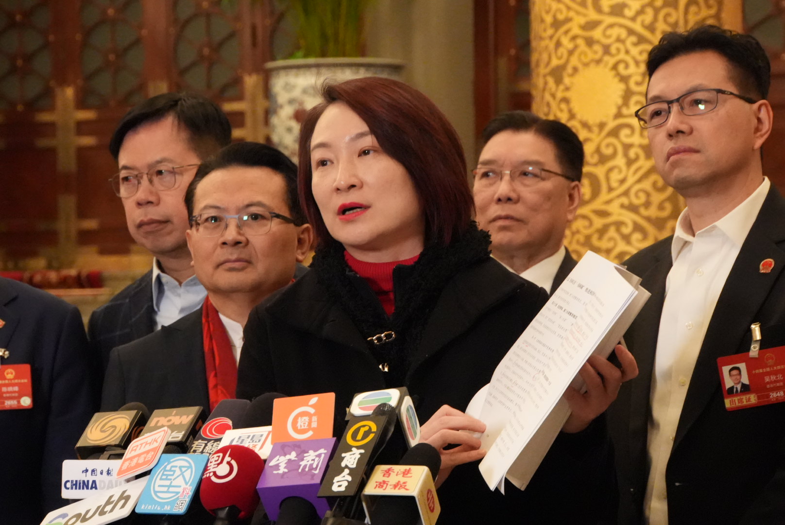 全國人大常委會委員、香港第八屆立法會主席李慧琼隨後發言,她說,今日聽取李強總理作政府工作報告感到振奮,形容是一份「承上啟下、穩中求進、以新促質、以民為本」的好報告。其中,政府工作報告明確指出支持香港更好融入和服務國家發展大局,令她深切感受到中央對香港的關懷與厚愛。另外,她表示,特區政府將制定首個五年規劃,這具有里程碑意義,立法會將全力配合特區政府,開展科學調研,確保香港規劃與國家「十五五」規劃緊密銜接,在國家發展大局中找準定位、發揮作用。她向現場傳媒展示手中的「十五五」規劃草案,清晰可見已劃許多重點。她說,草案有專章提及港澳,包含支持港澳鞏固提升競爭優勢、支持港澳更好融入及服務國家發展大局,相關內容對香港制定首個五年規劃具有重大的參考和指導意義。