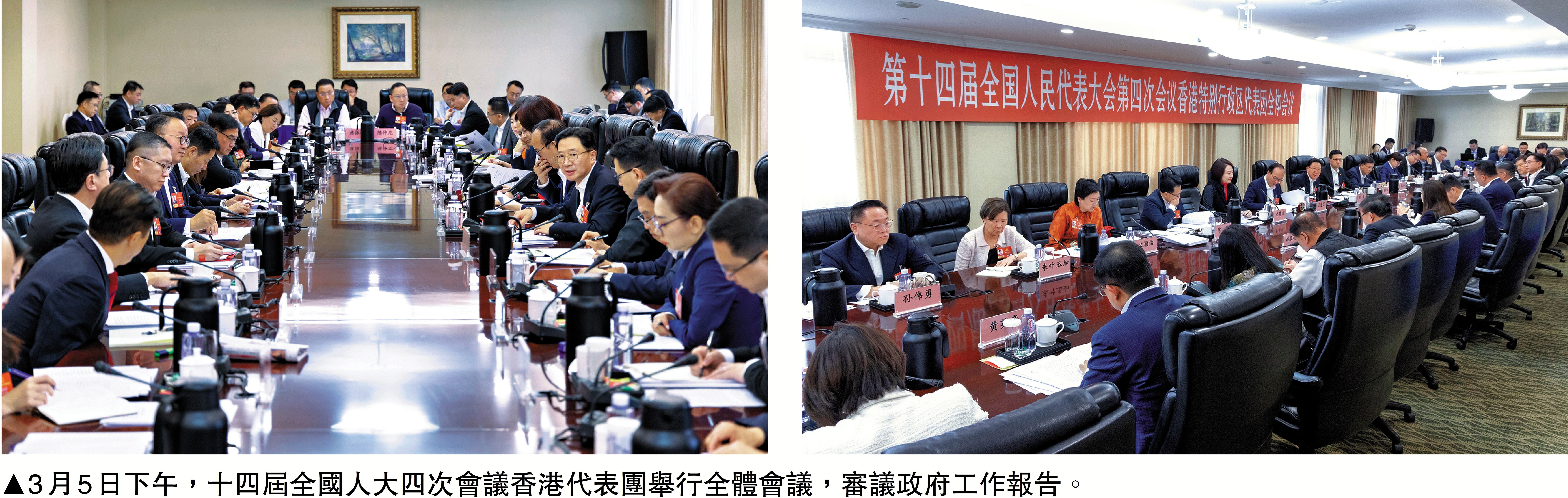 大公報報道,3月5日下午,十四屆全國人大四次會議香港代表團舉行全體會議,審議政府工作報告。19位港區全國人大代表踴躍發言,對報告給予高度評價。中央政府駐港聯絡辦主任周霽發言時表示,聆聽了李強總理代表國務院向大會作的政府工作報告,倍感振奮、備受鼓舞。報告總結成績實事求是,分析問題客觀辯證,部署工作長短結合、務實有力,一系列政策舉措從宏觀到微觀聚焦高質量發展、堅持創新驅動、突出改革攻堅、注重回應社會關切,是一份高舉旗幟、求真務實、振奮人心、催人奮進的好報告。