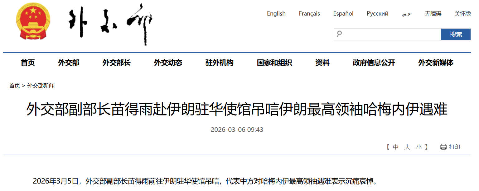 大公文匯網報道,2026年3月5日,外交部副部長苗得雨前往伊朗駐華使館弔唁,代表中方對哈梅內伊最高領袖遇難表示沉痛哀悼。